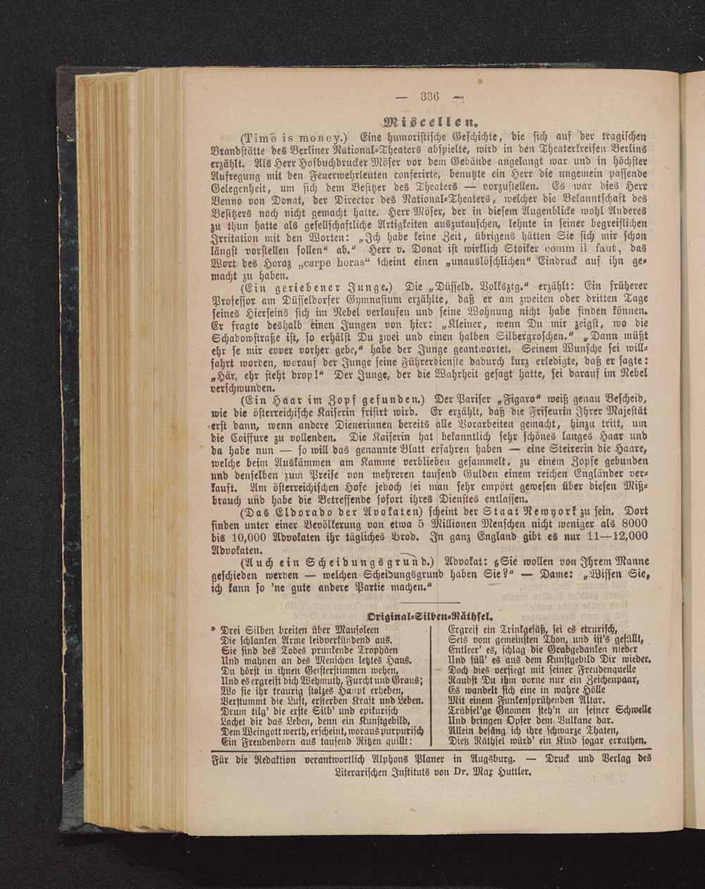 (I'iillö i8 mone^.) Eine humoristische Geschichte, die sich auf der tragischenBrandstätte des Berliner National-Theaters abspielte, wird in den Theaterkreisen Berlins erzählt. Als Herr Hofbuchdrucker Möser vor dem Gebäude angelangt war und in höchsterAufregung mit den Feuerwehrleuten conferirte, benutzte ein Herr die ungemein passendeGelegenheit, um sich dem Besitzer des Theaters — vorzustellen. Es war dies HerrBenno von Donat, der Direkter des National-Theaters, welcher die Bekanntschaft desBesitzers noch nicht gemacht hatte. Herr Möser, der in diesem Augenblicke wohl Andereszu thun hatte als gesellschaftliche Artigkeiten auszutauschen» lehnte in seiner begreiflichenIrritation mit den Worten: „Ich habe keine Zeit, übrigens hätten Sie sich mir schonlängst vorstellen sollen" ab." Herr v. Donat ist wirklich Stoiker eoinm il kaut, dasWort des Horaz „auixe Iioras" scheint einen „unauslöschlichen" Eindruck auf ihn ge-macht zu haben.