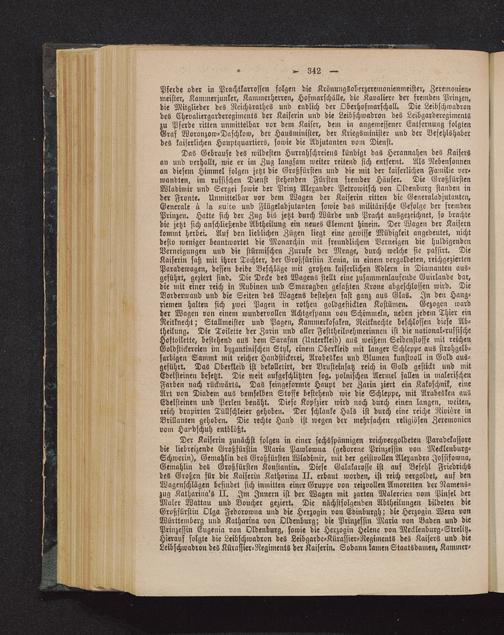 Der Kaiserin zunächst folgen in einer sechsspännigen reichvergoldeten Paradekassoredie liebreizende Großfürstin Maria Pawlowna (geborene Prinzessin von Mecklenburg-Schwerin ), Gemahlin des Großfürsten Wladimir, mit der geistvollen Alexandra Jossifowna,Gemahlin des Großfürsten Konstantin. Diese Galakarosse ist auf Befehl Friedrichsdes Großen für die Kaiserin Katharina II. erbaut worden, ist reich vergoldet, auf denWagenschlägen befindet sich inmitten einer Gruppe von reizvollen Amoretten der Namens-zug Katharina's II. Im Innern ist der Wagen mit zarten Malereien vom Pinsel derMaler Wattau und Boucher geziert. Die nächstfolgenden Abtheilungen bildeten dieGroßfürstin Olga Fedorowna und die Herzogin von Edinburgh ; die Herzogin Wera vonWürttemberg und Katharina von Oldenburg; die Prinzessin Maria von Baden und diePrinzessin Eugenia von Oldenburg, sowie die Herzogin Helene von Mecklenburg-Strelitz .Hierauf folgte die Leibschwadron des Leibgarde-Kürassier-Regiments des Kaisers und dieLeibschwadron des Kürassier-Regiments der Kaiserin. Sodann kamen Staatsdamen, Kammer-