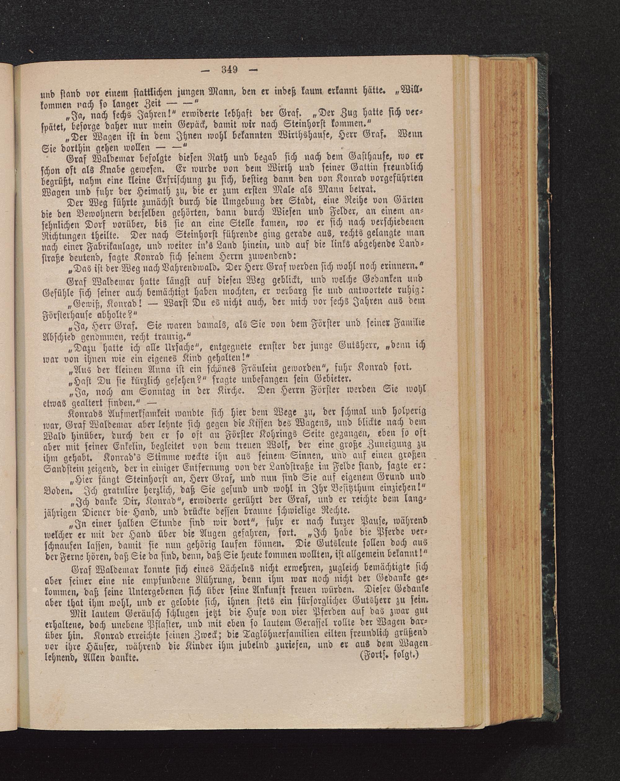 Graf Waldemar befolgte diesen Rath und begab sich nach dem Gasthause, wo erschon oft als Knabe gewesen. Er wurde von dem Wirth und seiner Gattin freundlichbegrüßt, nahm eine kleine Erfrischung zu sich, bestieg dann den von Konrad vorgeführtenWagen und fuhr der Heimath zu, die er zum ersten Male als Mann betrat.