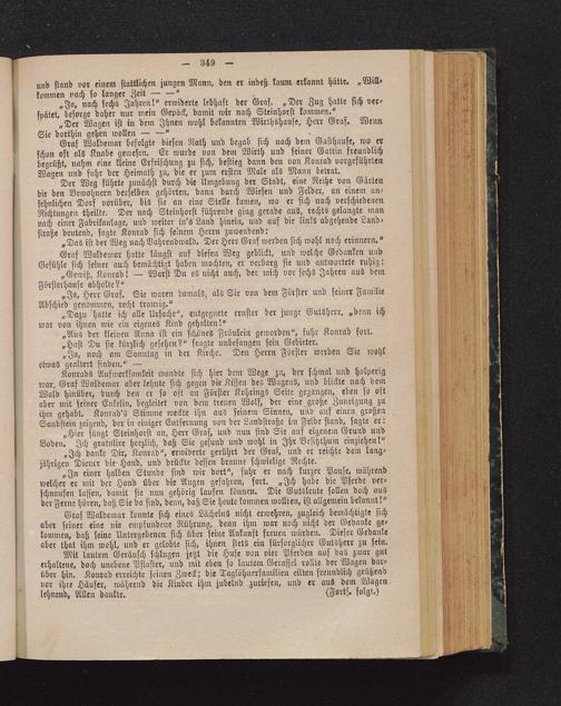 Mit lautem Geräusch schlugen jetzt die Hufe von vier Pferden auf das zwar guterhaltene, doch unebene Pflaster, und mit eben so lautem Gerassel rollte der Wagen dar-über hin. Konrad erreichte seinen Zweck; die Taglöhnerfamilion eilten freundlich grüßendvor ihre Häuser, während die Kinder ihm jubelnd zuriefen, und er aus dem Wagenlehnend, Allen dankte. (Forts, folgt.)