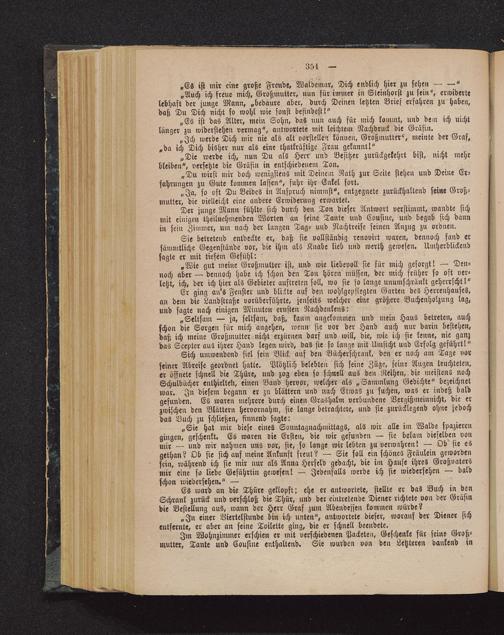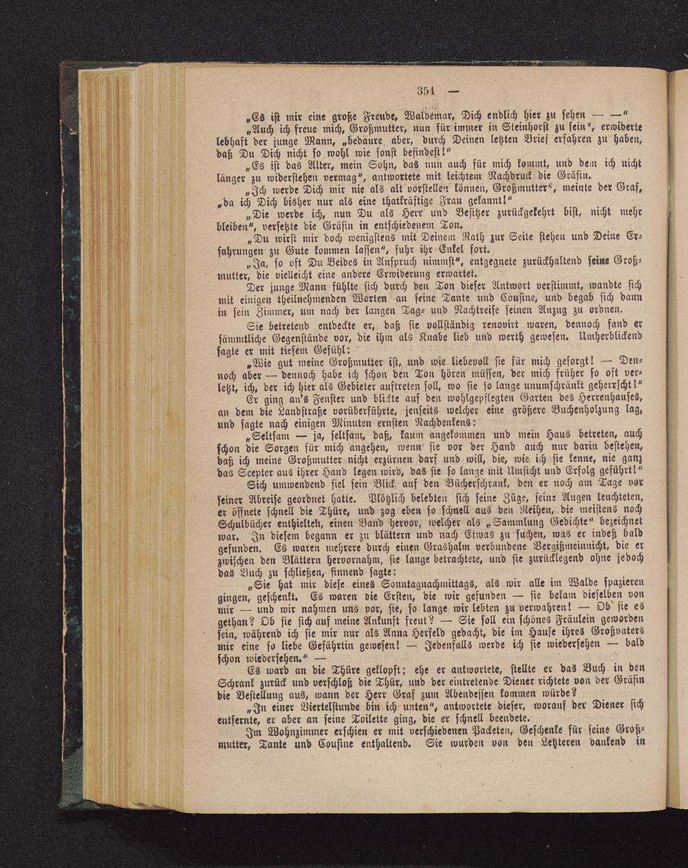 „Wie gut meine Großmutter ist, und wie liebevoll sie für mich gesorgt! — Den-noch aber — dennoch habe ich schon den Ton hören müssen, der mich früher so oft ver-letzt, ich, der ich hier als Gebieter auftreten soll, wo sie so lange unumschränkt geherrscht!"