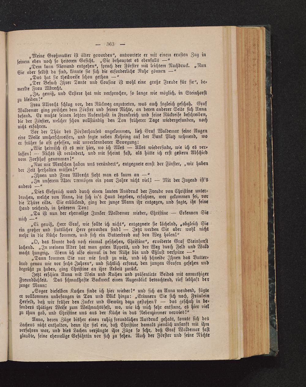 Frau Albrecht schlug vor, den Rückweg anzutreten, rvas auch sogleich geschah. GrafWaldemar ging zwischen dem Förster und seiner Nichte, an deren anderer Seite sich Annabefand. Er mußte seinen letzten Aufenthalt in Frankreich und seine Rückreise beschreiben,die der Förster, welcher schon vollständig den Ton früherer Tage wiedergefunden, nochnicht erfahren.