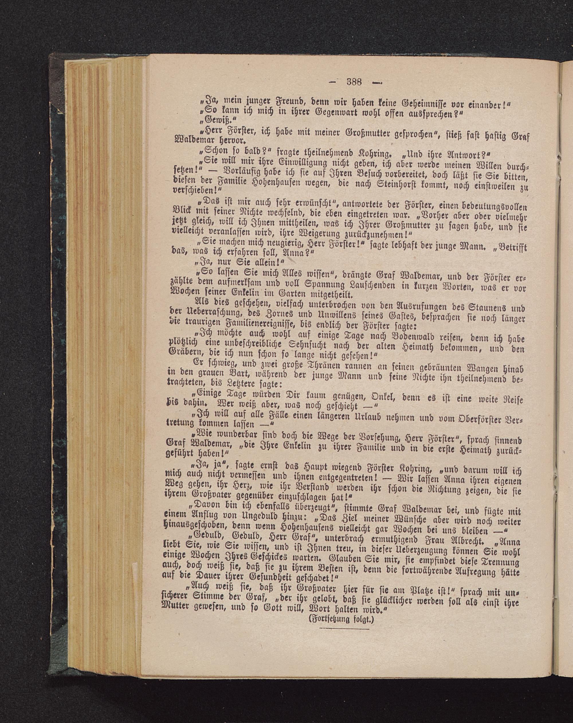 „Das ist mir auch sehr erwünscht", antwortete der Förster, einen bedeutungsvollenBlick mit seiner Nichte wechselnd, die eben eingetreten war. „Vorher aber oder vielmehrjetzt gleich, will ich Ihnen mittheilen, was ich Ihrer Großmutter zu sagen habe, und sievielleicht veranlassen wird, ihre Weigerung zurückzunehmen!"