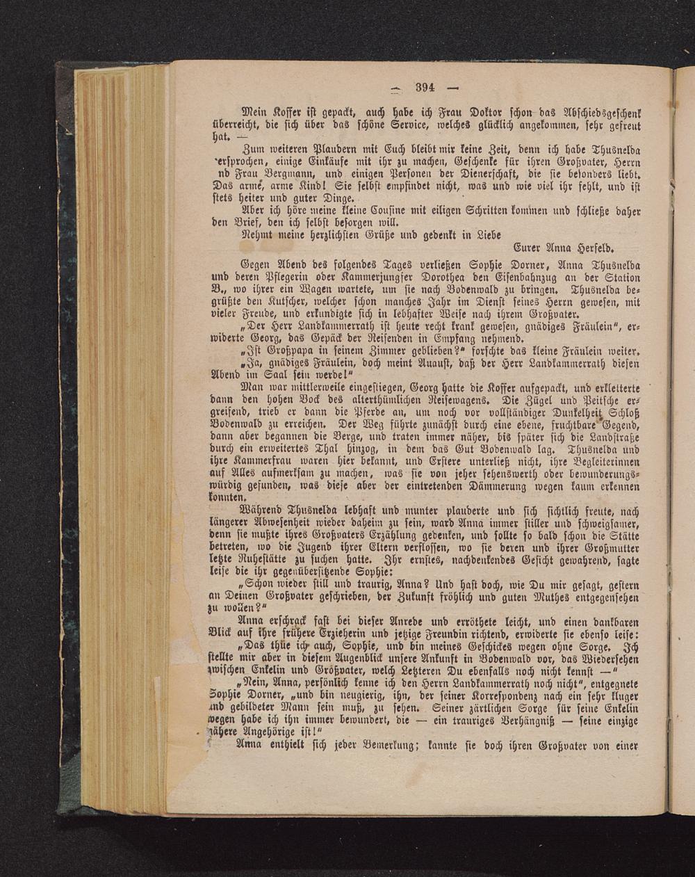Gegen Abend des folgendes Tages verließen Sophie Dörner, Anna Thusneldaund deren Pflegerin oder Kammerjungser Dorothea den Eisenbahnzug an der StationB., wo ihrer ein Wagen wartete, um sie nach Bodenwald zu bringen. Thusnelda be-grüßte den Kutscher, welcher schon manches Jahr im Dienst seines Herrn gewesen, mitvieler Freude, und erkundigte sich in lebhafter Weise nach ihrem Großvater.
