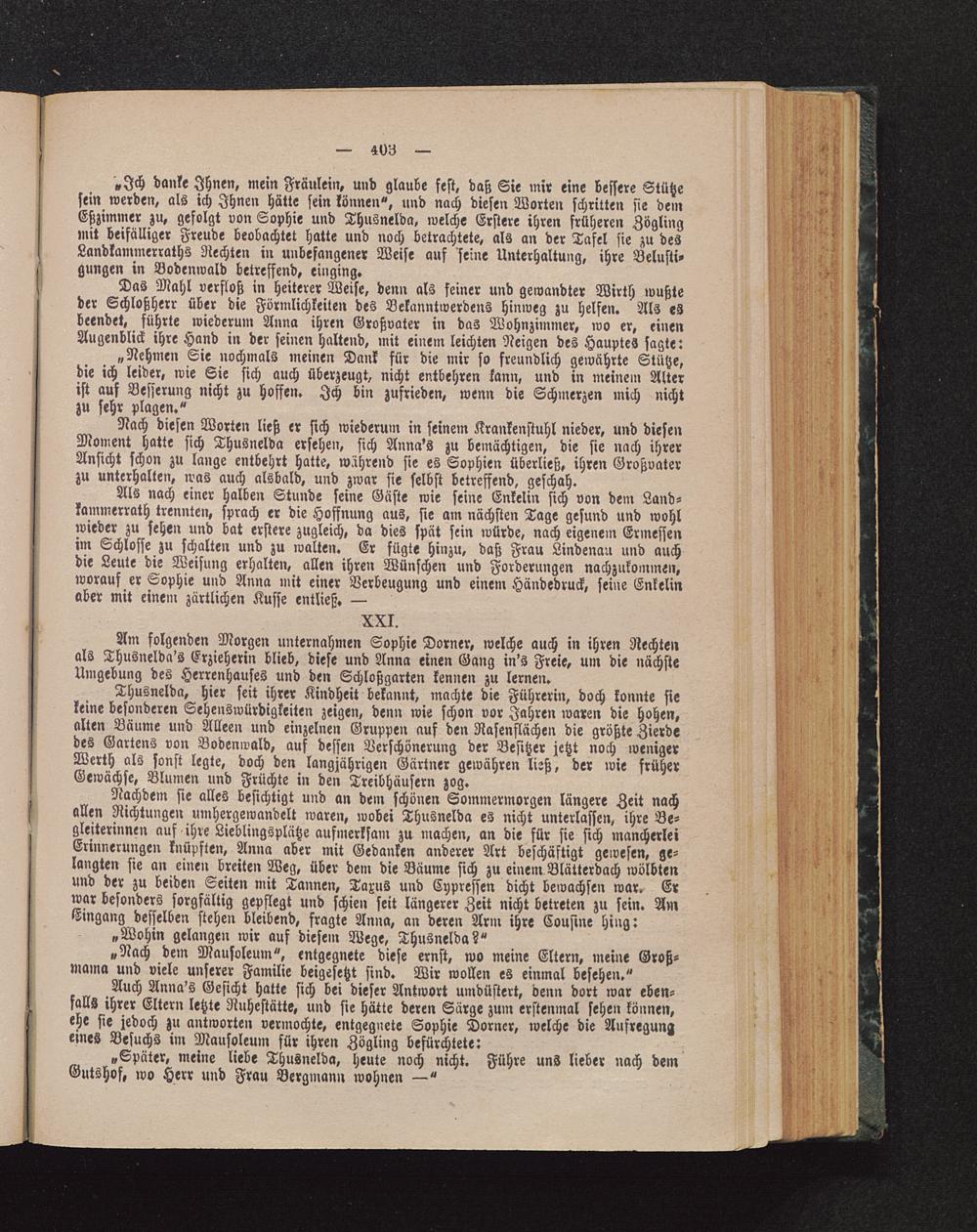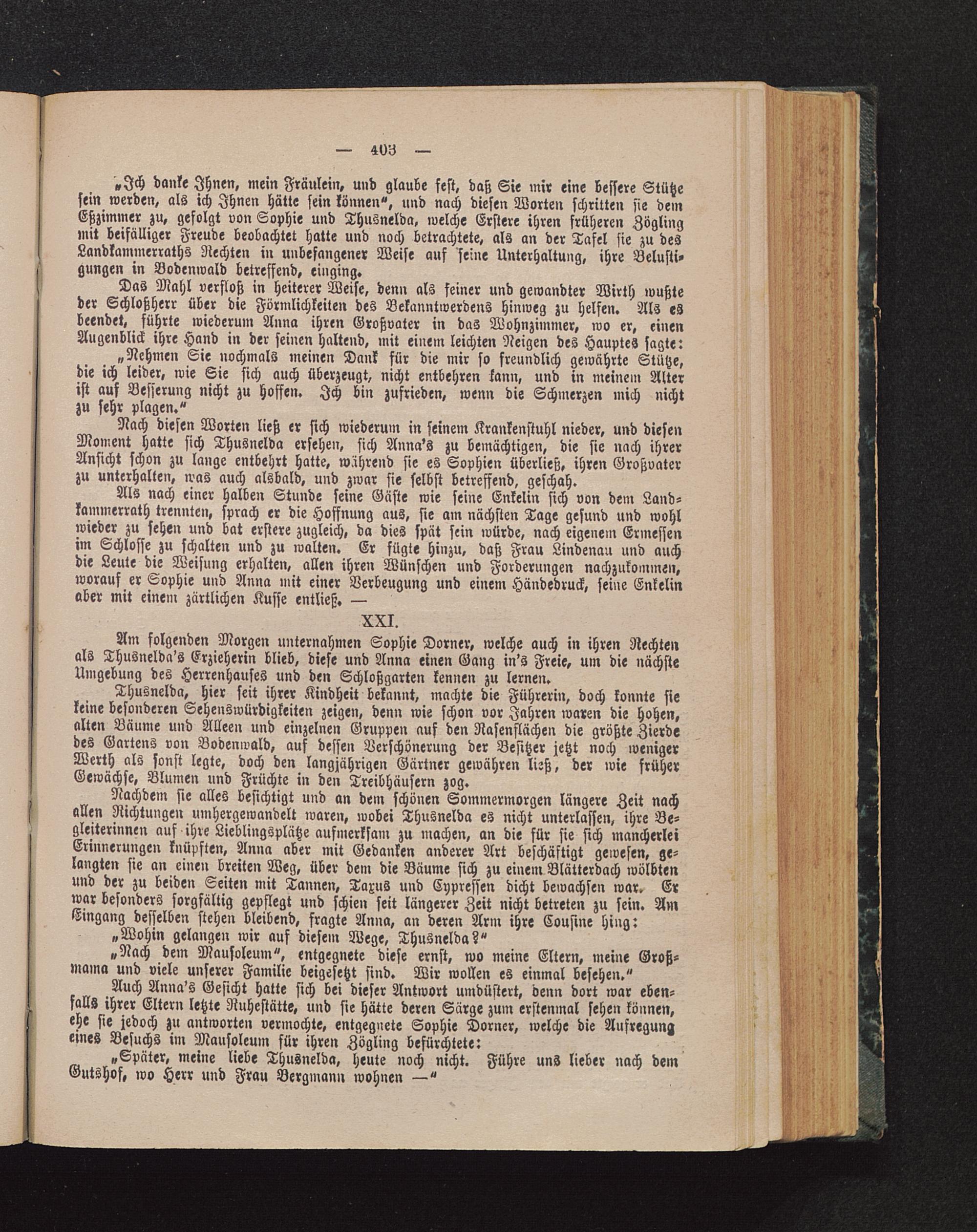 Am folgenden Morgen unternahmen Sophie Dörner, welche auch in ihren Rechtenals Thusnelda's Erzieherin blieb, diese und Anna einen Gang in's Freie, um die nächsteUmgebung des Herrenhauses und den Schloßgarten kennen zu lernen.
