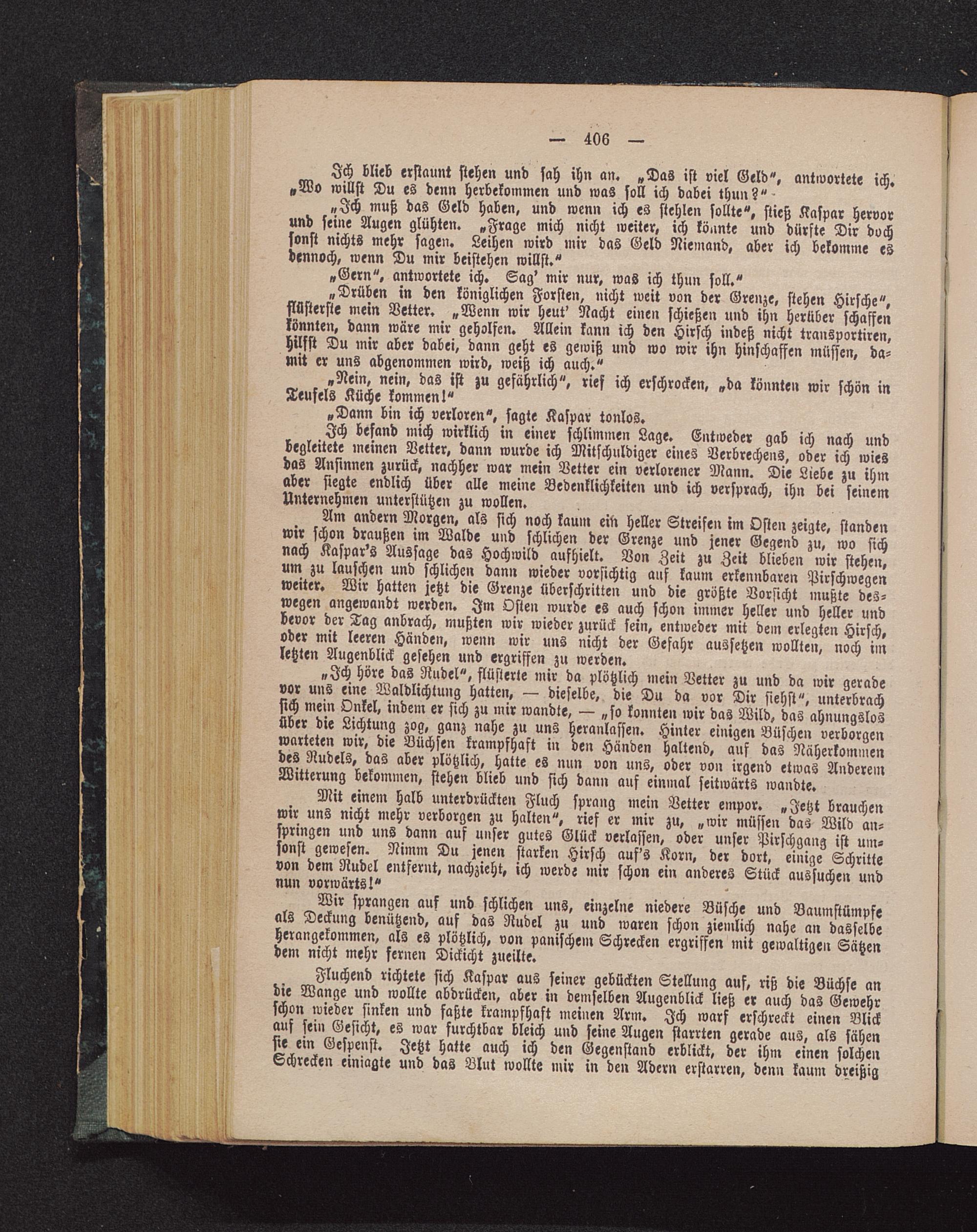 Am andern Morgen, als sich noch kaum ein Heller Streifen im Osten zeigte, standenwir schon draußen im Walde und schlichen der Grenze und jener Gegend zu, wo sichnach Kaspar's Aussage das Hochwild aufhielt. Von Zeit zu Zeit blieben wir stehen,um zu lauschen und schlichen dann wieder vorsichtig auf kaum erkennbaren Pirschwegenweiter. Wir hatten jetzt die Grenze überschritten und die größte Vorsicht mußte des-wegen angewandt werden. Im Osten wurde es auch schon immer Heller und Heller undbevor der Tag anbrach, mußten wir wieder zurück sein, entweder mit dem erlegten Hirsch,oder mit leeren Händen, wenn wir uns nicht der Gefahr aussetzen wollten, noch imletzten Augenblick gesehen und ergriffen zu werden.