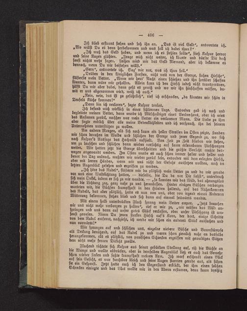Mit einem halb unterdrückten Fluch sprang mein Vetter empor. «Jetzt brauchenwir uns nicht mehr verborgen zu halten», rief er mir zu, „wir müssen das Wild an-springen und uns dann auf unser gutes Glück verlassen, oder unser Pirschgang ist um-sonst gewesen. Nimm Du jenen starken Hirsch auf's Korn, der dort, einige Schrittevon dem Nudel entfernt, nachzieht, ich werde mir schon ein anderes Stück aussuchen undnun vorwärts!»