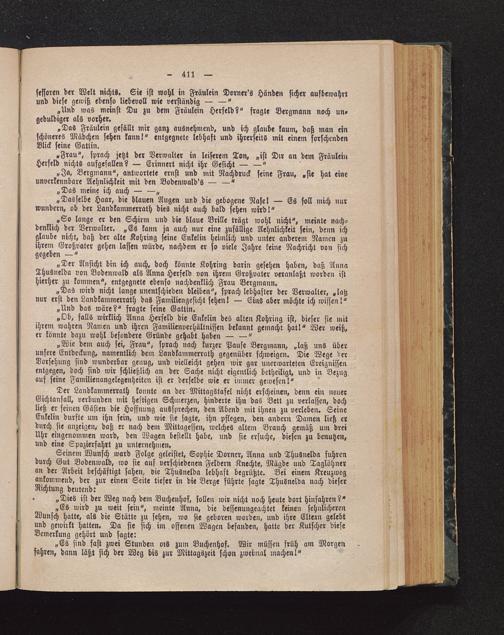 Seinen, Wunsch ward Folge geleistet, Sophie Dörner, Anna und Thusnelda fuhrendurch Gut Bodenwald, wo sie auf verschiedenen Feldern Knechte, Mägde und Taglöhneran der Arbeit beschäftigt sahen, vie Thusnelda lebhaft begrüßte. Bei einem Kreuzwegankommend, der zur einen Seite tiefer in die Berge führte sagte Thusnelda nach dieserRichtung deutend: