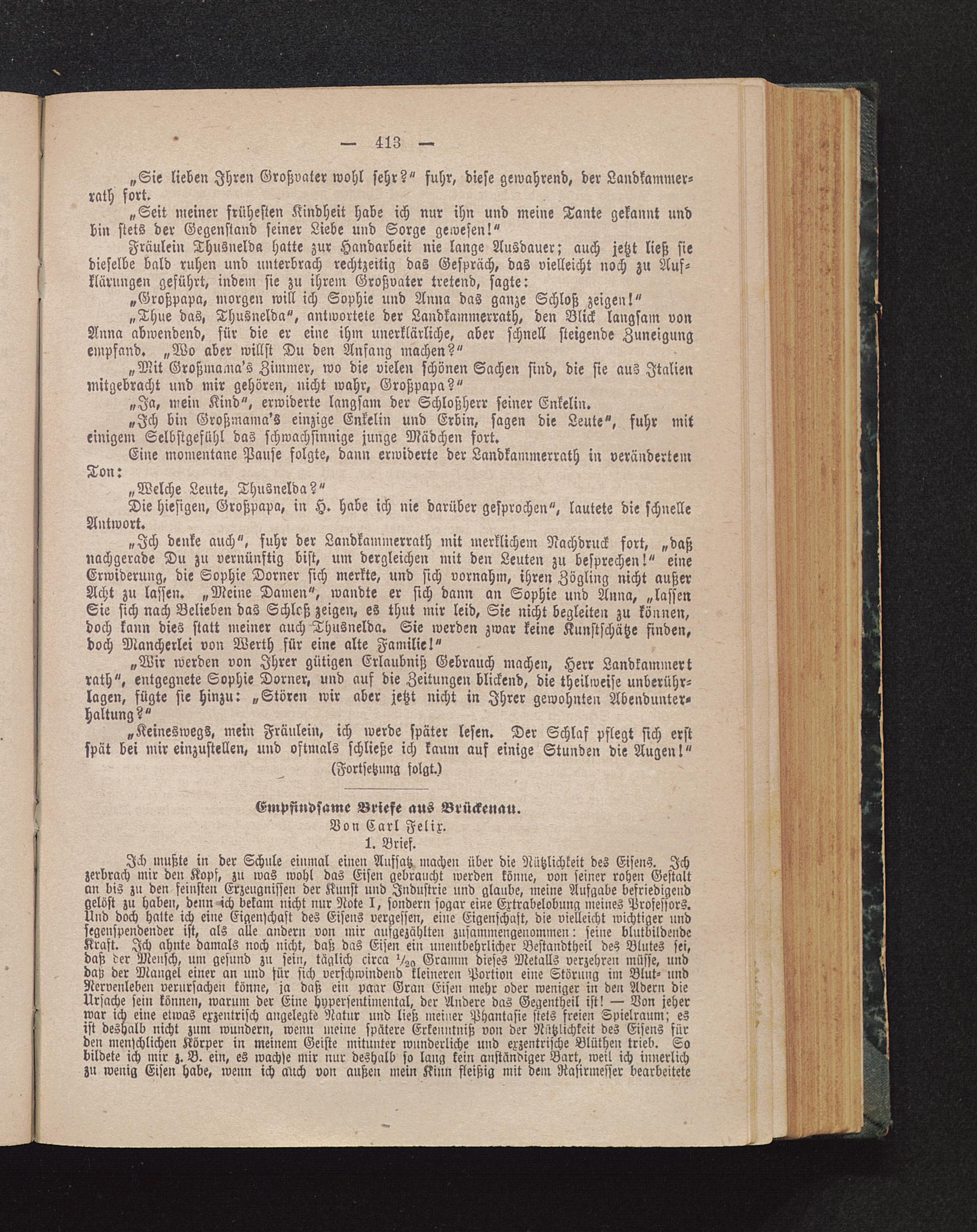 „Ich denke auch", fuhr der Landkammerrath mit merklichem Nachdruck fort, „daßnachgerade Du zu vernünftig bist, um dergleichen mit den Leuten zu besprechen!" eineErwiderung, die Sophie Dörner sich merkte, und sich vornahm, ihren Zögling nicht außerAcht zu lassen. „Meine Damen", wandte er sich dann an Sophie und Anna, „lassenSie sich nach Belieben das Schloß zeigen, es thut mir leid, Sie nicht begleiten zu können,doch kann dies statt meiner auch Thusnelda . Sie werden zwar keine Kunstschätze finden,doch Mancherlei von Werth für eine alte Familie!"