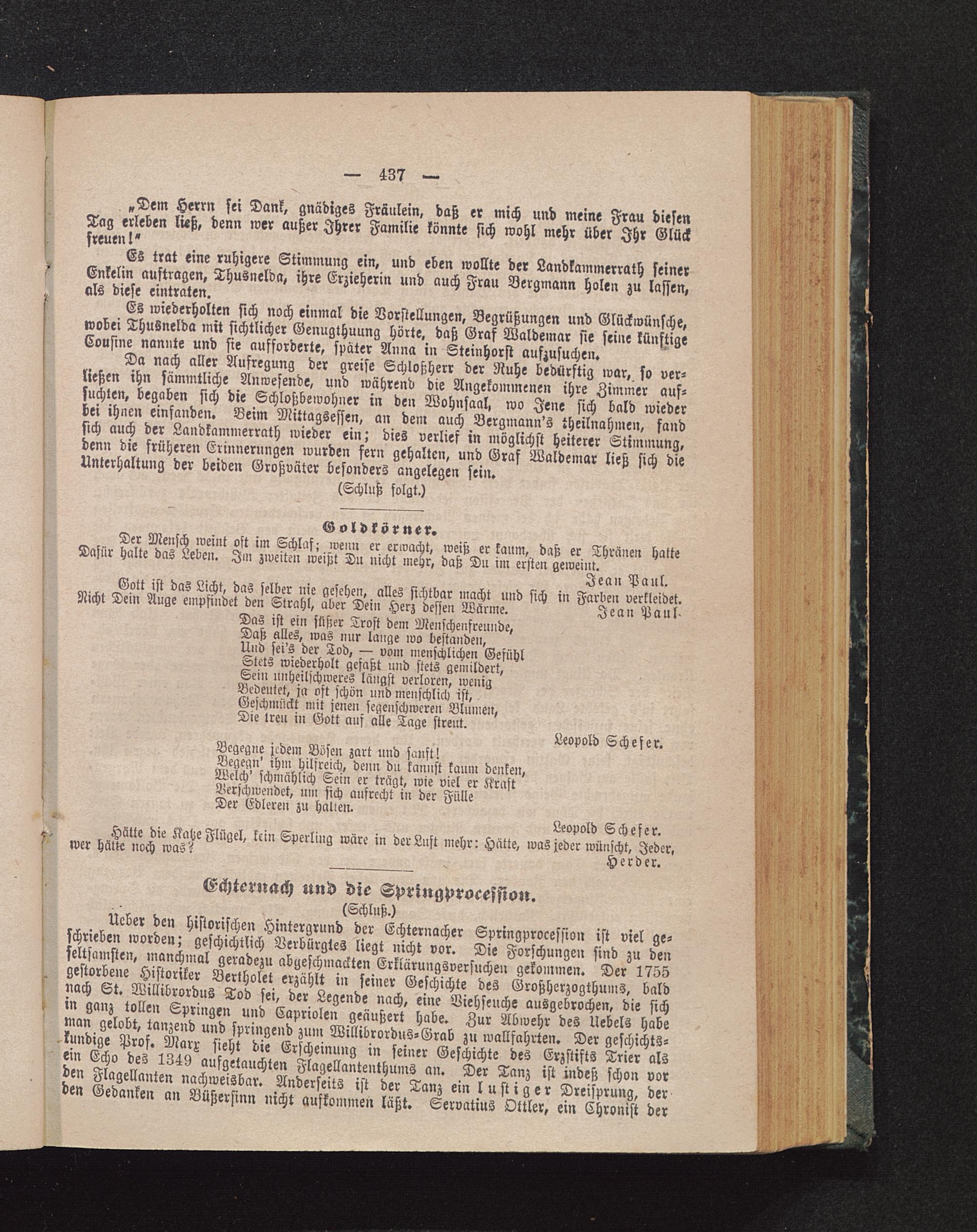 Es trat eine ruhigere Stimmung ein, und eben wollte der Landkammerrath seinerEnkelin auftragen, Thusnelda , ihre Erzieherin und auch Frau Bergmann holen zu lassen,als diese eintraten.