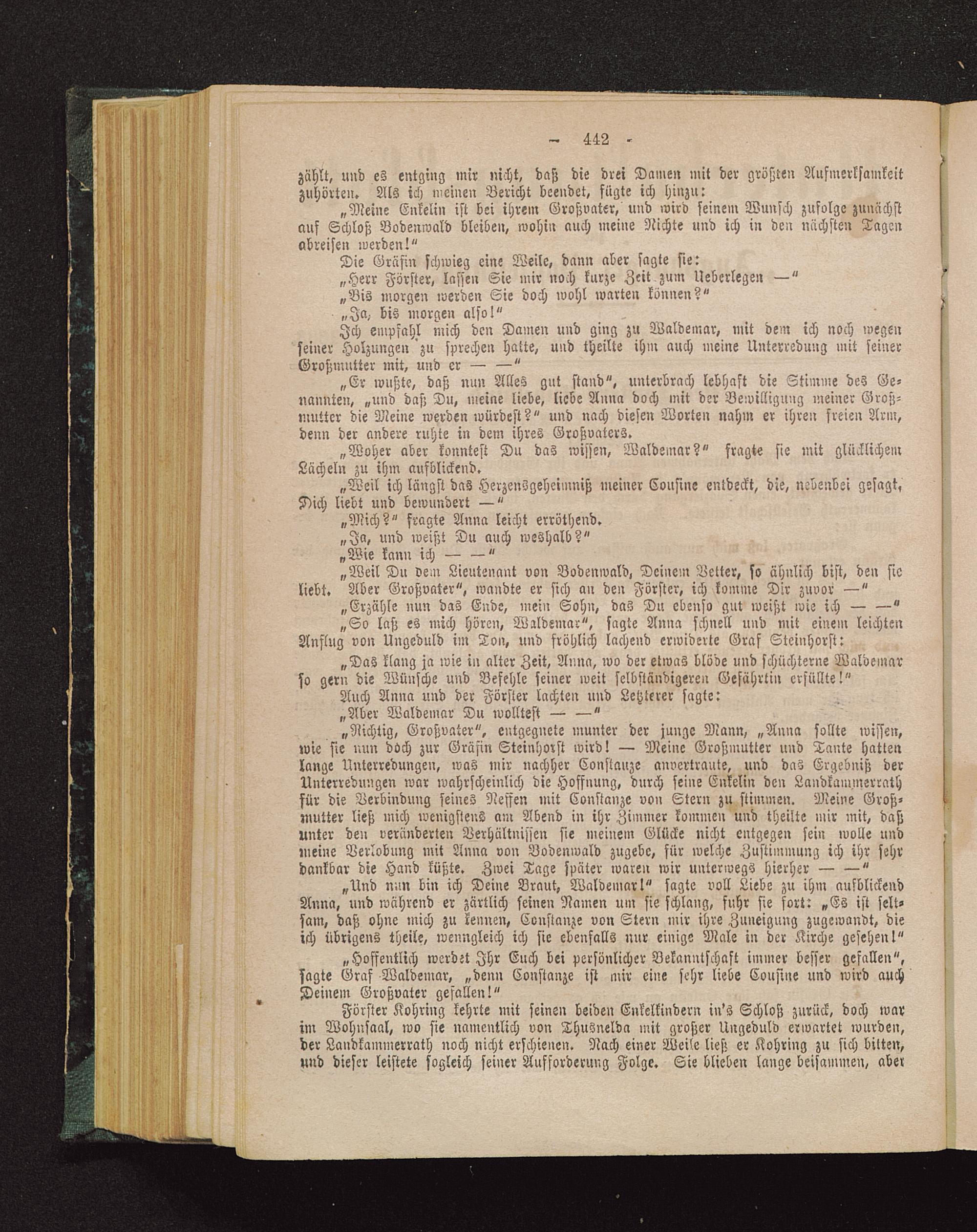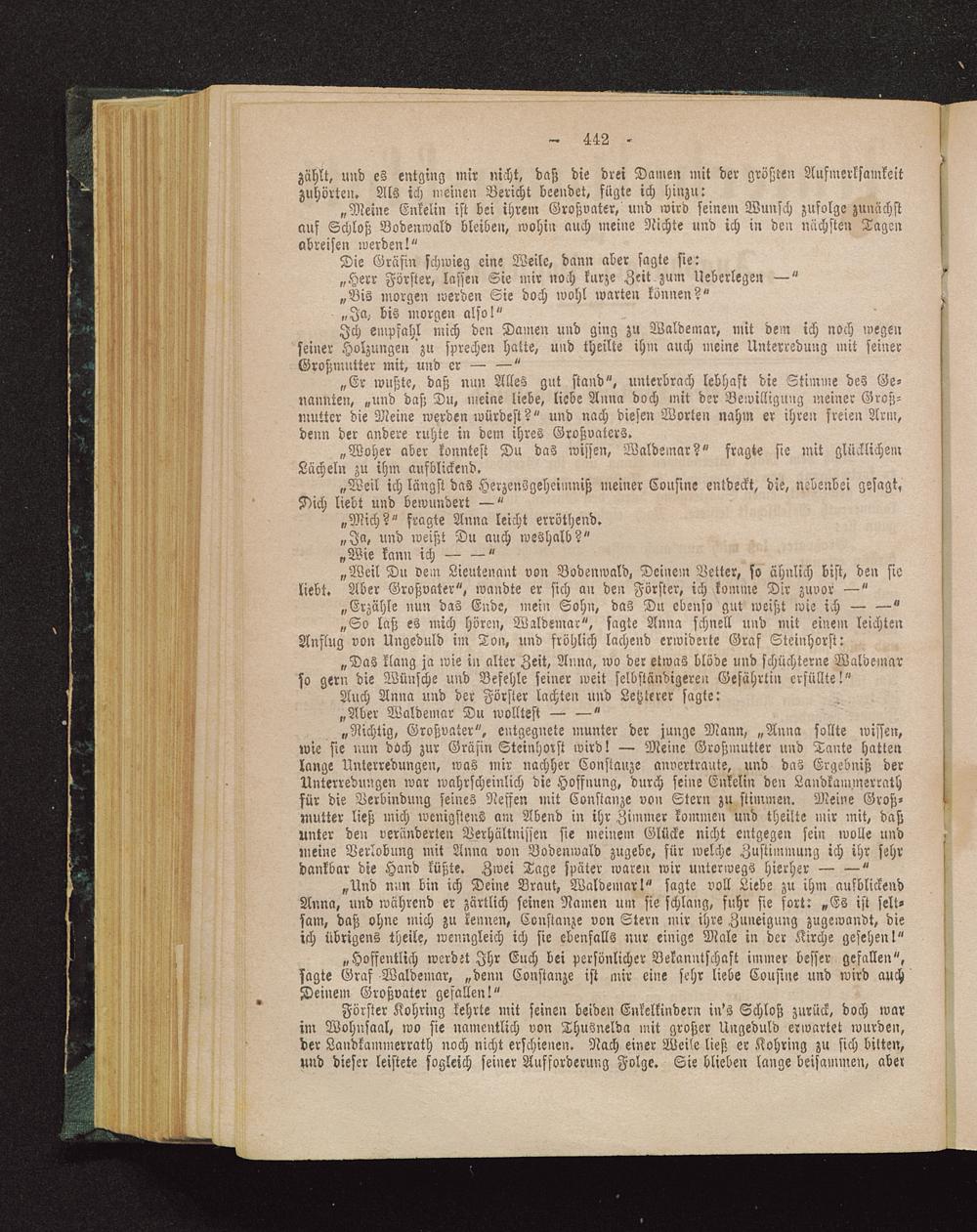 „Er wußte, daß nun Alles gut stand", unterbrach lebhaft die Stimme des Ge-nannten, „und daß Du, meine liebe, liebe Anna doch mit der Bewilligung meiner Groß-mutter die Meine werden würdest?" und nach diesen Worten nahm er ihren freien Arm,denn der andere ruhte in dem ihres Großvaters.