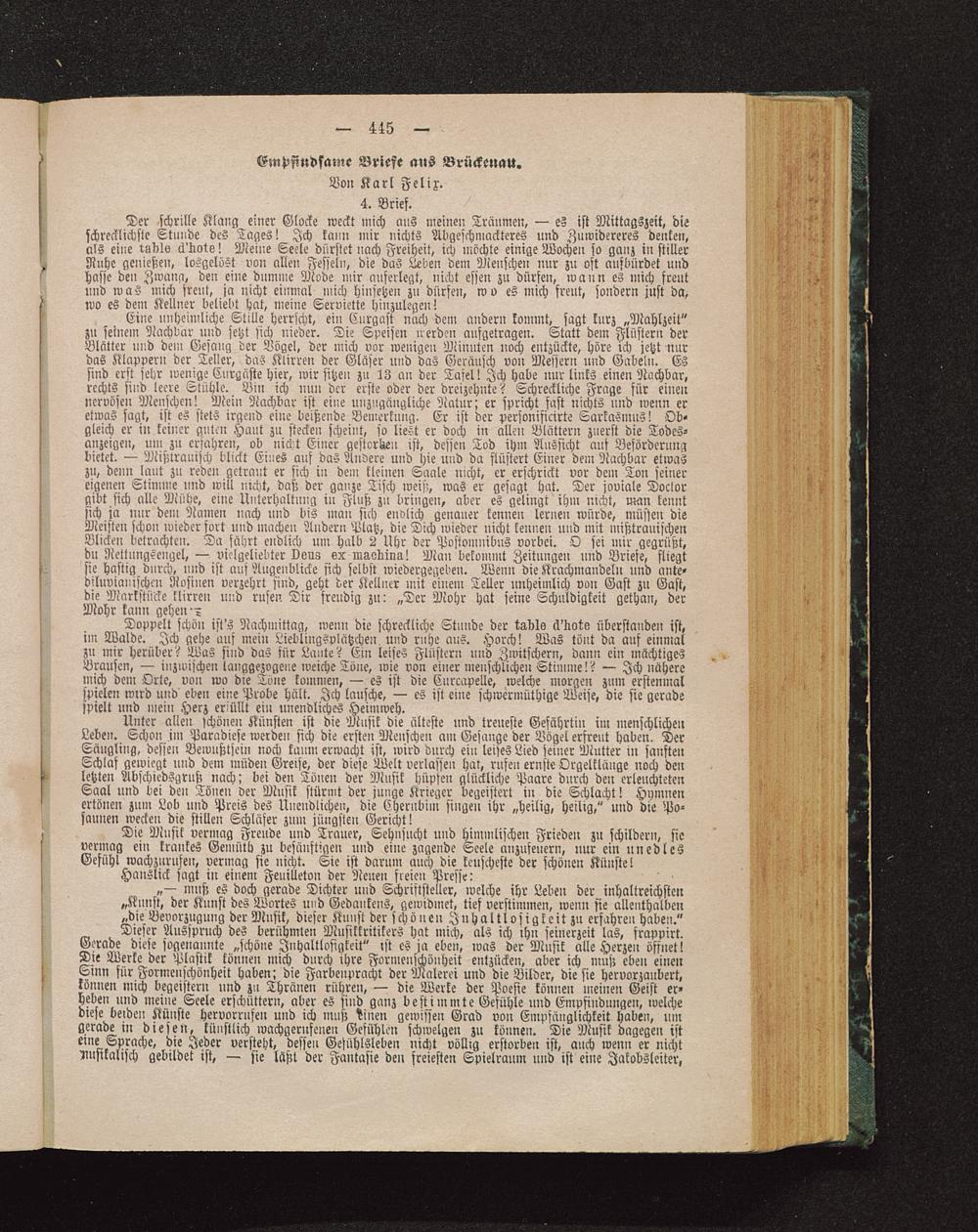 Die Musik vermag Freude und Trauer, Sehnsucht und himmlischen Frieden zu schildern, sievermag ein krankes Gemüth zu besänftigen und eine zagende Seele anzufeuern, nur ein unedlesGefühl wachzurufen, vermag sie nicht. Sie ist darum auch die keuscheste der schönen Künste!