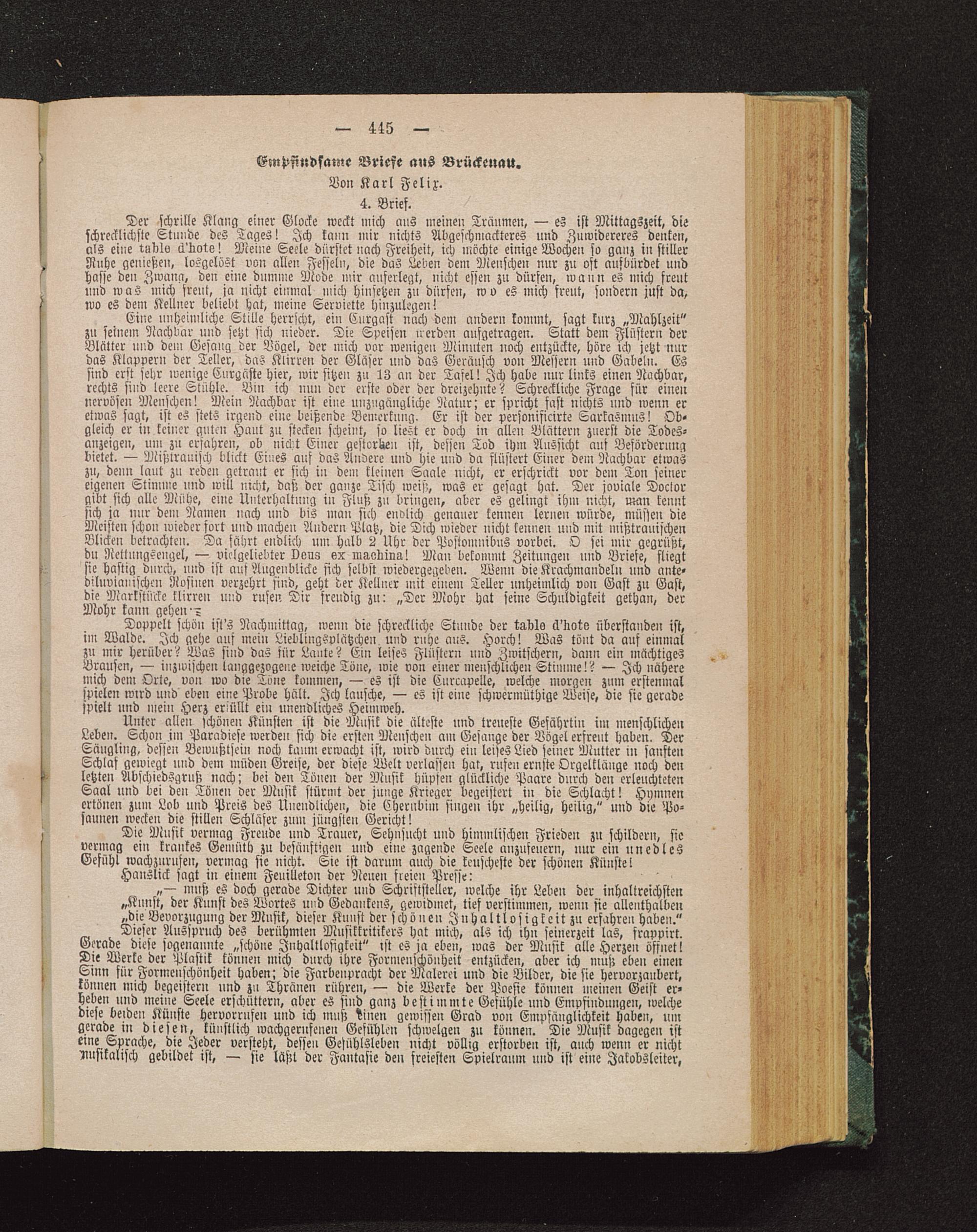 Der schrille Klang einer Glocke weckt mich ans meinen Träumen, — es ist Mittagszeit, dieschrecklichste Stunde des Tages! Ich kann inir nichts Abgeschmackteres und Zuwidereres denken,als eine rndls ck'kwte! Meine Seele dürstet nach Freiheit, ich möchte einige Wochen so ganz in stillerNahe genießen, losgelöst von allen Fesseln, die das Leben dem Menschen nur zu ost aufbürdet undhasse den Zwang, den eine dumme Mode mir auferlegt, nicht essen zu dürfen, wann es mich freutund was mich freut, ja nicht einmal mich hinsetzen zu dürfen, wo es mich freut, sondern just da,wo es dem Kellner beliebt hat, meine Serviette hinzulegen!