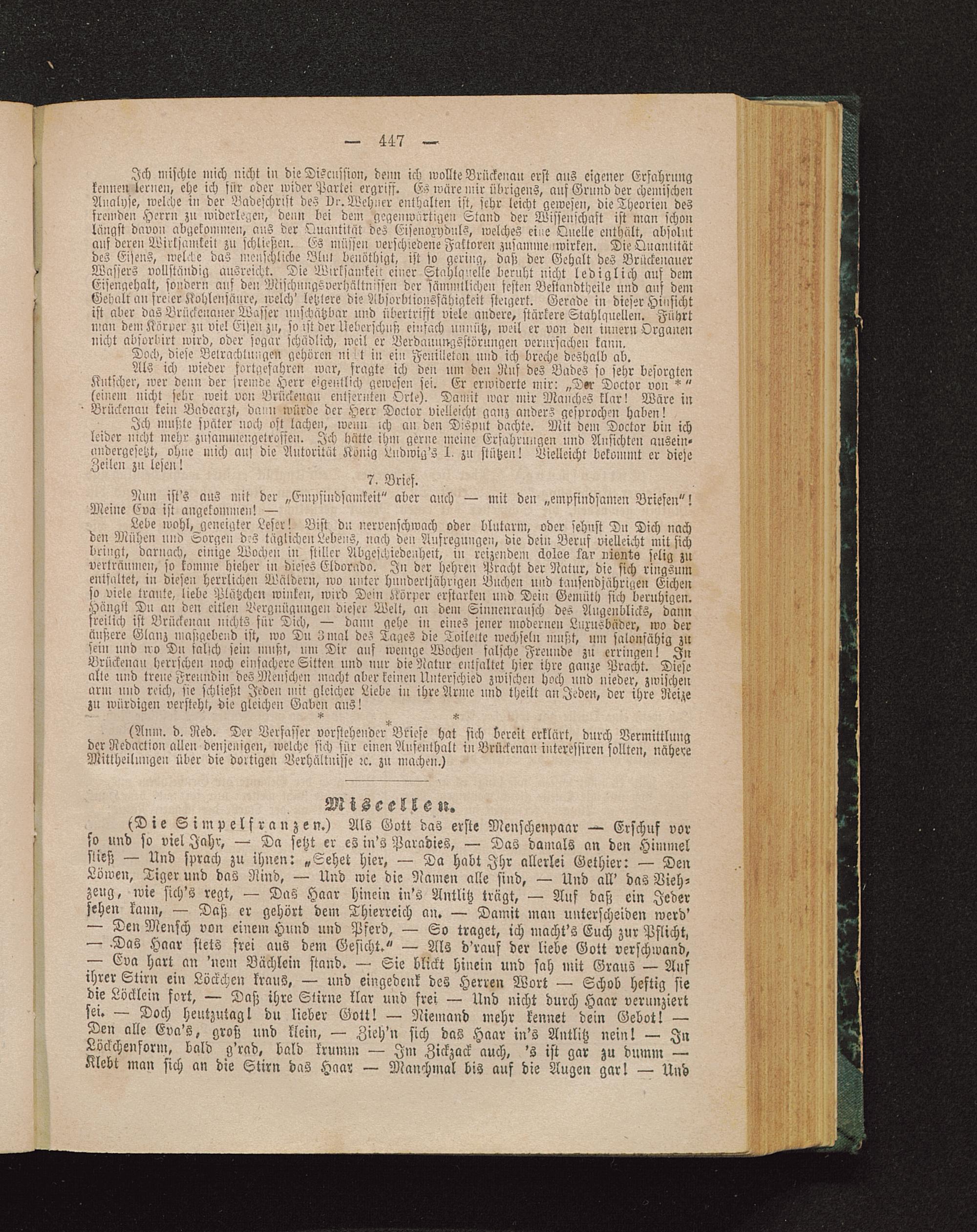 Als ich wieder fortgefahren war, fragte ich den um den Ruf des Bades so sehr besorgtenKutscher, wer denn der fremde Herr eigentlich gewesen sei. Er erwiderte mir: „Der Doctor von * "(einem nicht sehr weit von Brückenan entjernten Orte). Damit war mir Manches klar! Wäre inBrückenan kein Badearzt, dann würde der Herr Doctor vielleicht ganz anders gesprochen haben!