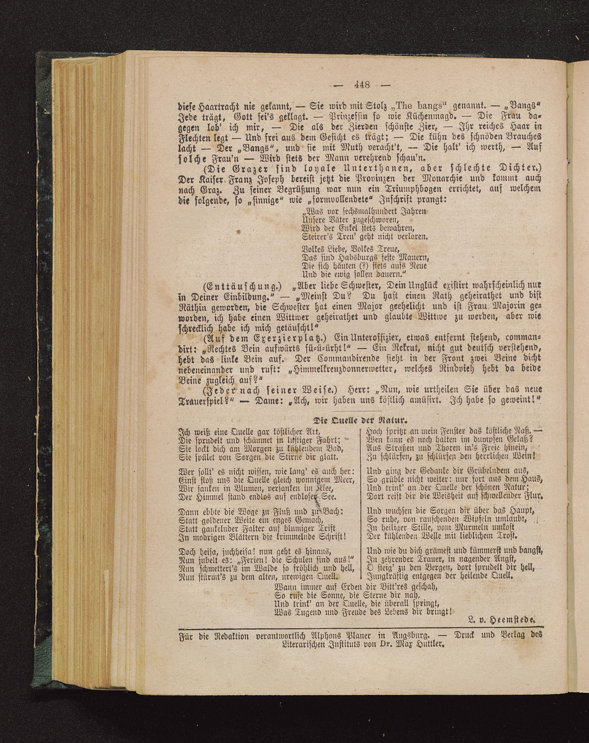 (Die Grazer sind loyale Unterthanen, aber schlechte Dichter.)Der Kaiser Franz Joseph bereist jetzt die Provinzen der Monarchie und kommt auchnach Graz . Zu seiner Begrüßung war nun ein Triumphbogen errichtet, auf welchemdie folgende, so „sinnige" wie „formvollendete" Inschrift prangt: