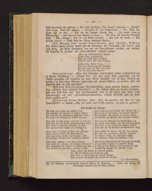 diese Haartracht nie gekannt, — Sie wird mit Stolz „Isis IianZs" genannt. — „Vangs"Jede trägt, Gott sei's geklagt. — Prinzessin so wie Küchenmagd. — Die Frau da-gegen lob' ich mir, — Die als der Zierden schönste Zier, — Ihr reiches Haar inFlechten legt — Und frei aus dem Gesicht es trägt; — Die kühn des schnöden Braucheslacht — Der „Bangs", und sie mit Muth veracht't, — Die halt' ich werth, — Aufsolche Frau'n — Wird stets der Mann verehrend schau'n.