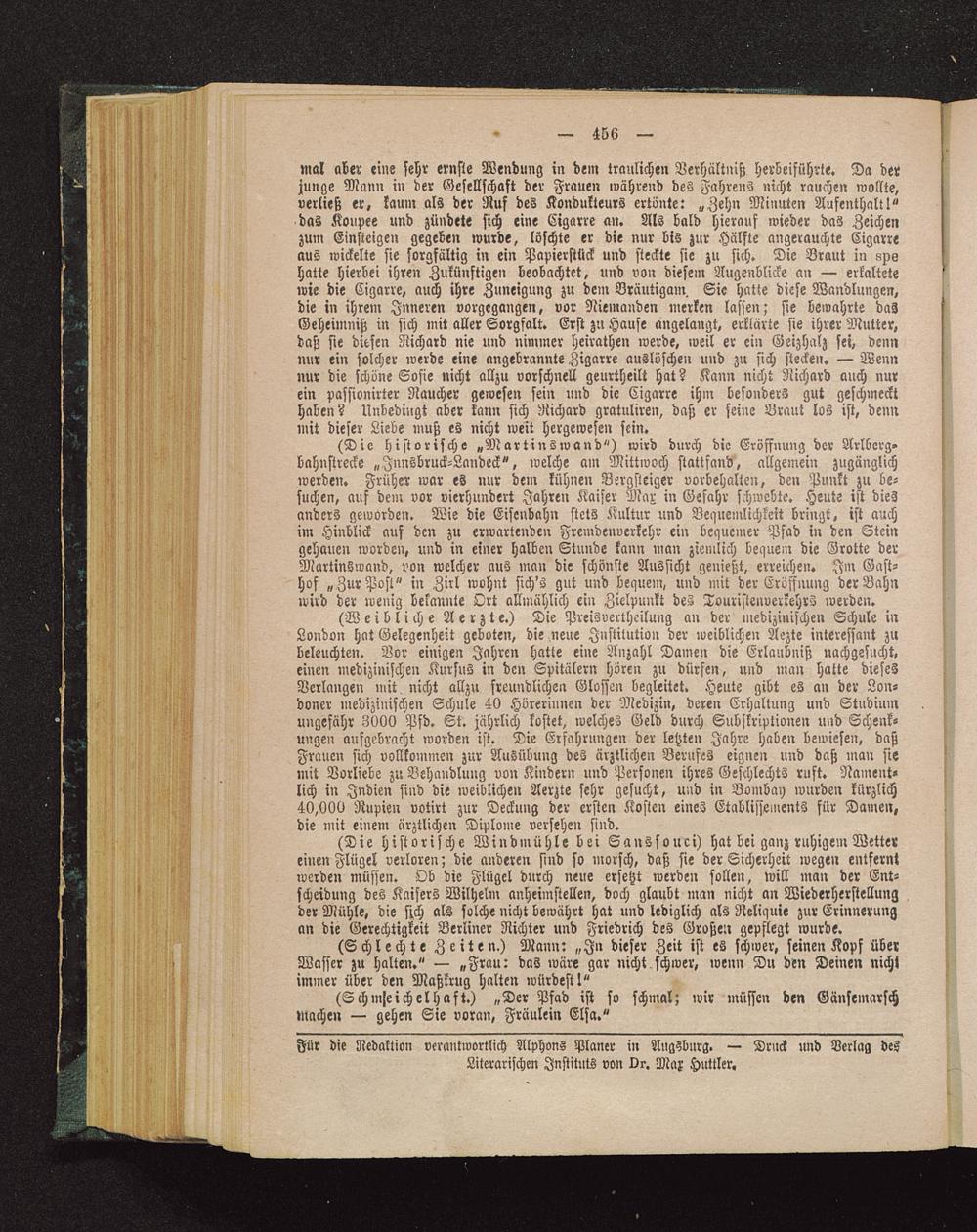 mal aber eine sehr ernste Wendung in dem traulichen Verhältniß herbeiführte. Da derjunge Mann in der Gesellschaft der Frauen während des Fahrens nicht rauchen wollte,verließ er, kaum als der Nuf des Kondukteurs ertönte: „Zehn Minuten Aufenthalt!"das Koupee und zündete sich eine Cigarre an. Als bald hierauf wieder das Zeichenzum Einsteigen gegeben wurde, löschte er die nur bis zur Hälfte angerauchte Cigarreaus wickelte sie sorgfältig in ein Papierstück und steckte sie zu sich. Die Braut in axohatte hierbei ihren Zukünftigen beobachtet, und von diesem Augenblicke an — erkaltetewie die Cigarre, auch ihre Zuneigung zu dem Bräutigam. Sie hatte diese Wandlungen,die in ihrem Inneren vorgegangen, vor Niemanden merken lassen; sie bewahrte dasGeheimniß in sich mit aller Sorgfalt. Erst zu Hause angelangt, erklärte sie ihrer Mutter,daß sie diesen Richard nie und nimmer heirathen werde, weil er ein Geizhalz sei, dennnur ein solcher werde eine angebrannte Zigarre auslöschen und zu sich stecken. — Wennnur die schöne Sofie nicht allzu vorschnell geurtheilt hat? Kann nicht Richard auch nurein passionirter Raucher gewesen sein und die Cigarre ihm besonders gut geschmeckthaben? Unbedingt aber kann sich Richard gratuliren, daß er seine Braut los ist, dennmit dieser Liebe muß es nicht weit Hergewesen sein.