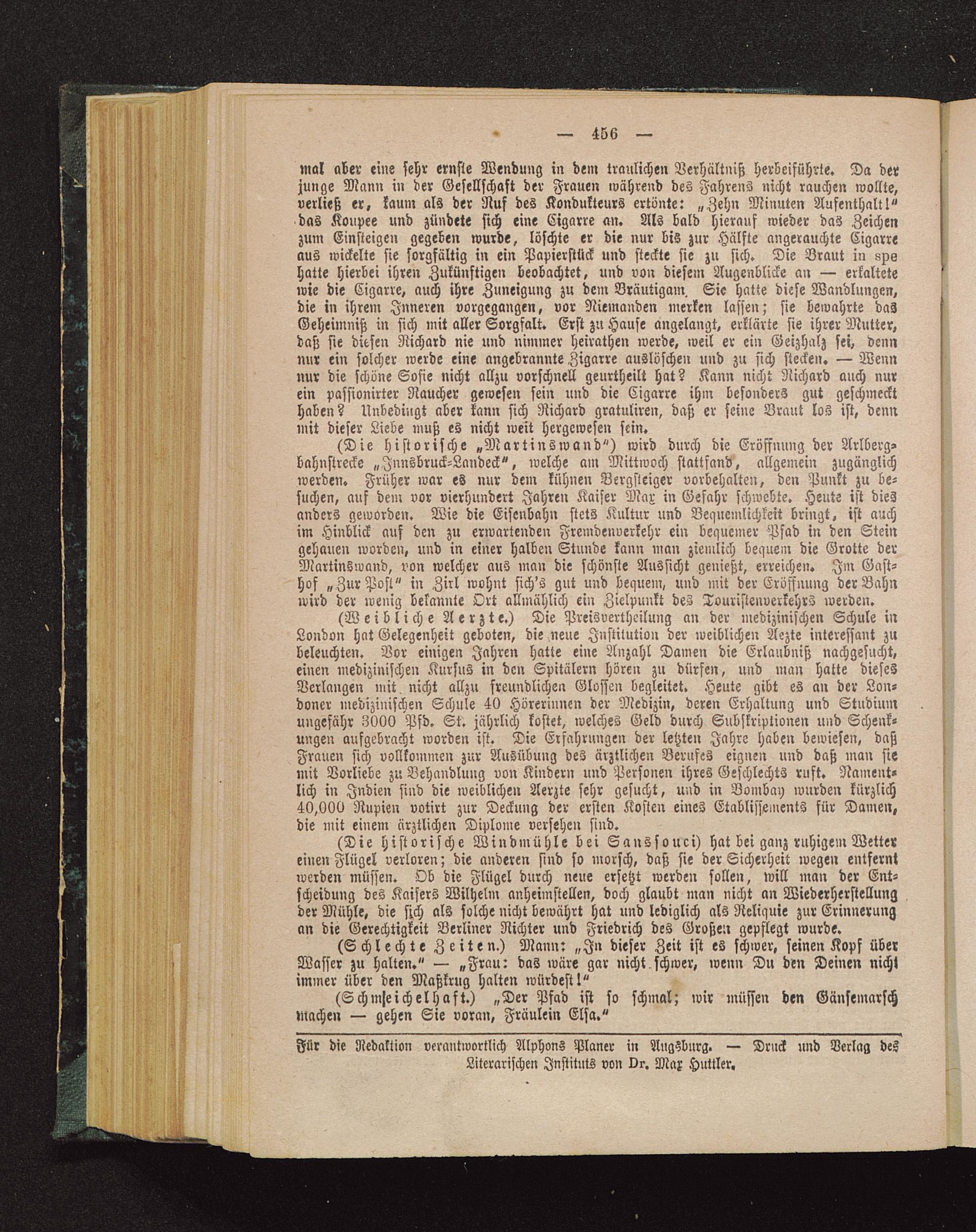 (Die historische „Martinswand") wird durch die Eröffnung der Arlberg-bahnstrecke „Jnnsbruck-Landeck", welche am Mittwoch stattfand, allgemein zugänglichwerden. Früher war es nur dem kühnen Bergsteiger vorbehalten, den Punkt zu be-suchen, auf dem vor vierhundert Jahren Kaiser Mar in Gefahr schwebte. Heute ist diesanders geworden. Wie die Eisenbahn stets Kultur und Bequemlichkeit bringt, ist auchim Hinblick auf den zu erwartenden Fremdenverkehr ein bequemer Pfad in den Steingehauen worden, und in einer halben Stunde kann man ziemlich bequem die Grotte derMartinswand, von welcher aus man die schönste Aussicht genießt, erreichen. Im Gast-hof » Zur Post" in Zirl wohnt sich's gut und bequem, und mit der Eröffnung der Bahnwird der wenig bekannte Ort allmählich ein Zielpunkt des Touristenverkehrs werden.