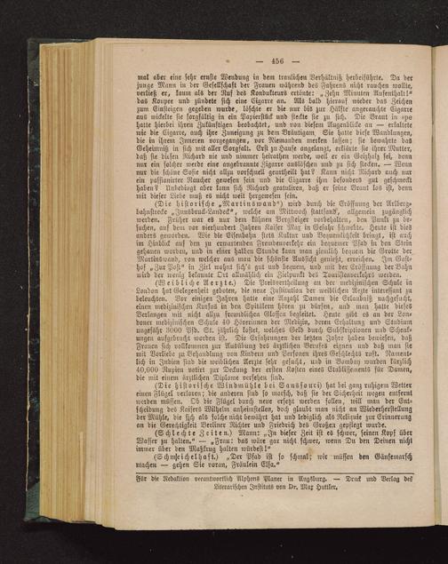 (Weibliche Aerzte.) Die Preisvertheilung an der medizinischen Schule inLondon hat Gelegenheit geboten, die neue Institution der weiblichen Aezte interessant zubeleuchten. Vor einigen Jahren hatte eine Anzahl Damen die Erlaubniß nachgesucht,einen medizinischen Kursus in den Spitälern hören zu dürfen, und man hatte diesesVerlangen mit. nicht allzu freundlichen Glossen begleitet. Heute gibt es an der Lon-doner medizinischen Schule 40 Hörerinnen der Medizin, deren Erhaltung und Studiumungefähr 3000 Pfd. St. jährlich kostet, welches Geld durch Subskriptionen und Schenk-ungen aufgebracht worden ist. Die Erfahrungen der letzten Jahre haben bewiesen, daßFrauen sich vollkommen zur Ausübung des ärztlichen Berufes eignen und daß man siemit Vorliebe zu Behandlung von Kindern und Personen ihres Geschlechts ruft. Nament-lich in Indien sind die weiblichen Aerzte sehr gesucht, und in Bombay wurden kürzlich40,000 Rupien votirt zur Deckung der ersten Kosten eines Etablissements für Damen,die mit einem ärztlichen Diplome versehen sind.