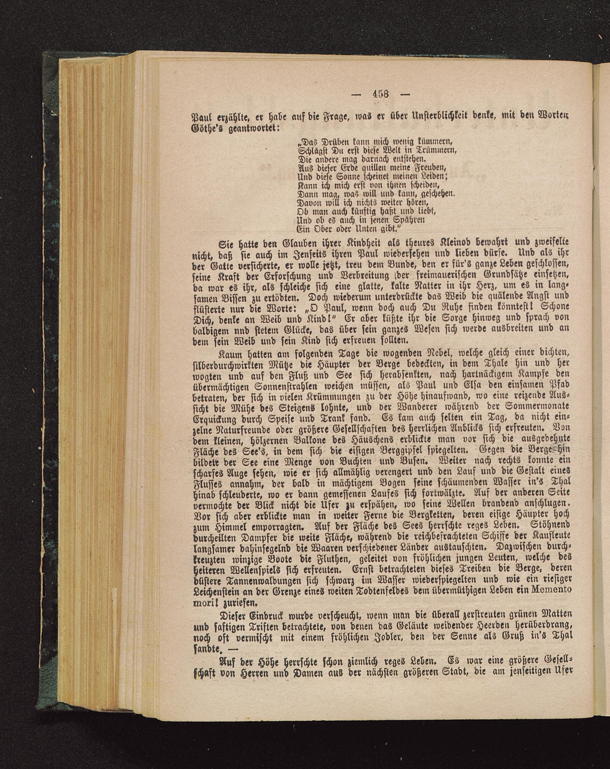 Kaum hatten am folgenden Tage die wogenden Nebel, welche gleich einer dichten,silberdurchwirkten Mütze die Häupter der Berge bedeckten, in dem Thale hin und herwogten und auf den Fluß und See sich herabsenkten, nach hartnäckigem Kampfe denübermächtigen Sonnenstrahlen weichen müssen, als Paul und Elsa den einsamen Pfadbetraten, der sich in vielen Krümmungen zu der Höhe Hinaufwand, wo eine reizende Aus-sicht die Mühe des SteigenS lohnte, und der Wanderer während der SommermonateErquickung durch Speise und Trank fand. Es kam auch selten ein Tag, da nicht ein-zelne Naturfreunde oder größere Gesellschaften des herrlichen Anblicks sich erfreuten. Vondem kleinen, hölzernen Balköne des Häuschens erblickte man vor sich die ausgedehnteFläche des See's , in dem sich die eisigen Berggipfel spiegelten. Gegen die Berge-Hinbildete der See eine Menge von Buchten und Busen. Weiter nach rechts konnte einscharfes Auge sehen, wie er sich allmählig verengert und den Lauf und die Gestalt einesFlusses annahm, der bald in mächtigem Bogen seine schäumenden Wasser in's Thalhinab schleuderte» wo er dann gemessenen Laufes sich fortwälzte. Auf der anderen Seitevermochte der Blick nicht die Ufer zu erspähen, wo seine Wellen brandend anschlugen.Vor sich aber erblickte man in weiter Ferne die Bergketten» deren eisige Häupter hochzum Himmel emporragten. Auf der Fläche des Sees herrschte reges Leben. Stöhnenddurcheilten Dampfer die weite Fläche, während die reichbefrachteten Schiffe der Kaufleutelangsamer dahinsegelnd die Waaren verschiedener Länder austauschten. Dazwischen durch-kreuzten winzige Boote die Fluthen, geleitet von fröhlichen jungen Leuten, welche desheiteren WellenspielS sich erfreuten. Ernst betrachteten dieses Treiben die Berge, derendüstere Tannenwaldungen sich schwarz im Wasser wiederspiegelten und wie ein riesigerLeichenstein an der Grenze eines weiten Todtenfeldes dem übermüthigen Leben ein Llsmontomoril zuriefen.