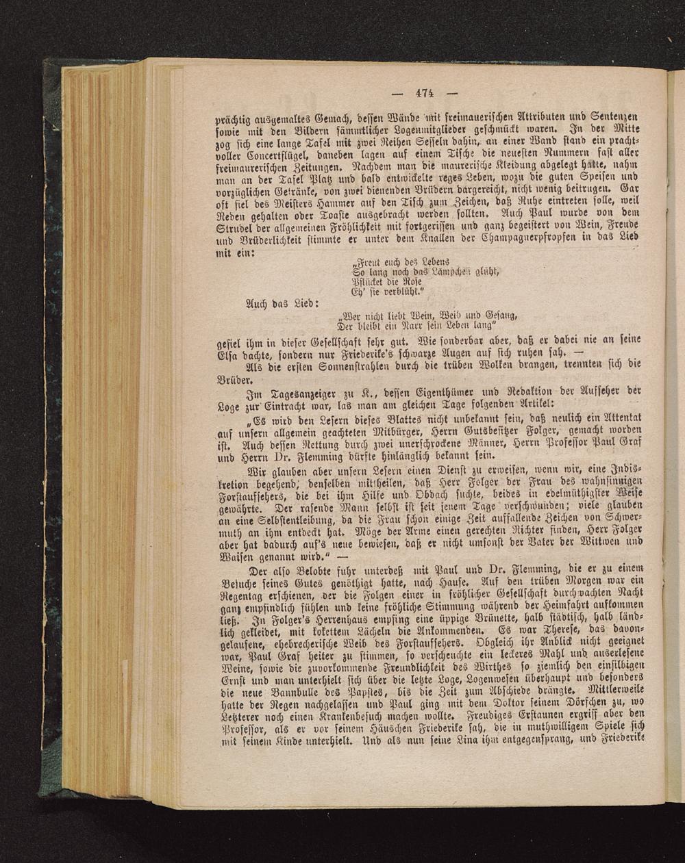 „Es wird den Lesern dieses Blattes nicht unbekannt sein, daß neulich ein Attentatauf unsern allgemein geachteten Mitbürger, Herrn Gutsbesitzer Folger, gemacht wordenist. Auch dessen Rettung durch zwei unerschrockene Männer, Herrn Professor Paul Grafund Herrn Dr. Flemming dürfte hinlänglich bekannt sein.