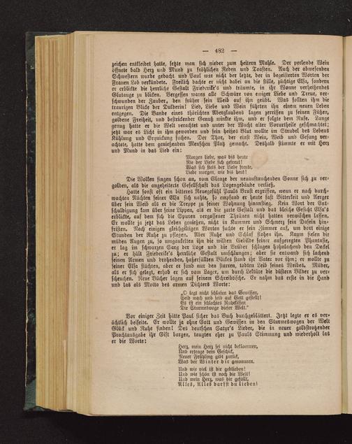 Vor einiger Zeit hätte Paul sicher das Buch durchgeblättert. Jetzt legte er es ver-ächtlich beiseite. Er wollte ja ohne Gott und Gewissen in den Sturmeswogen der WeltGlück und Ruhe finden! Des deutschen Satyr's Lieder, die in neuer golbstrotzenderPrachtausgabe ihr Gift bargen, taugten eher zu Pauls Stimmung und wiederholt laSer die Worte: