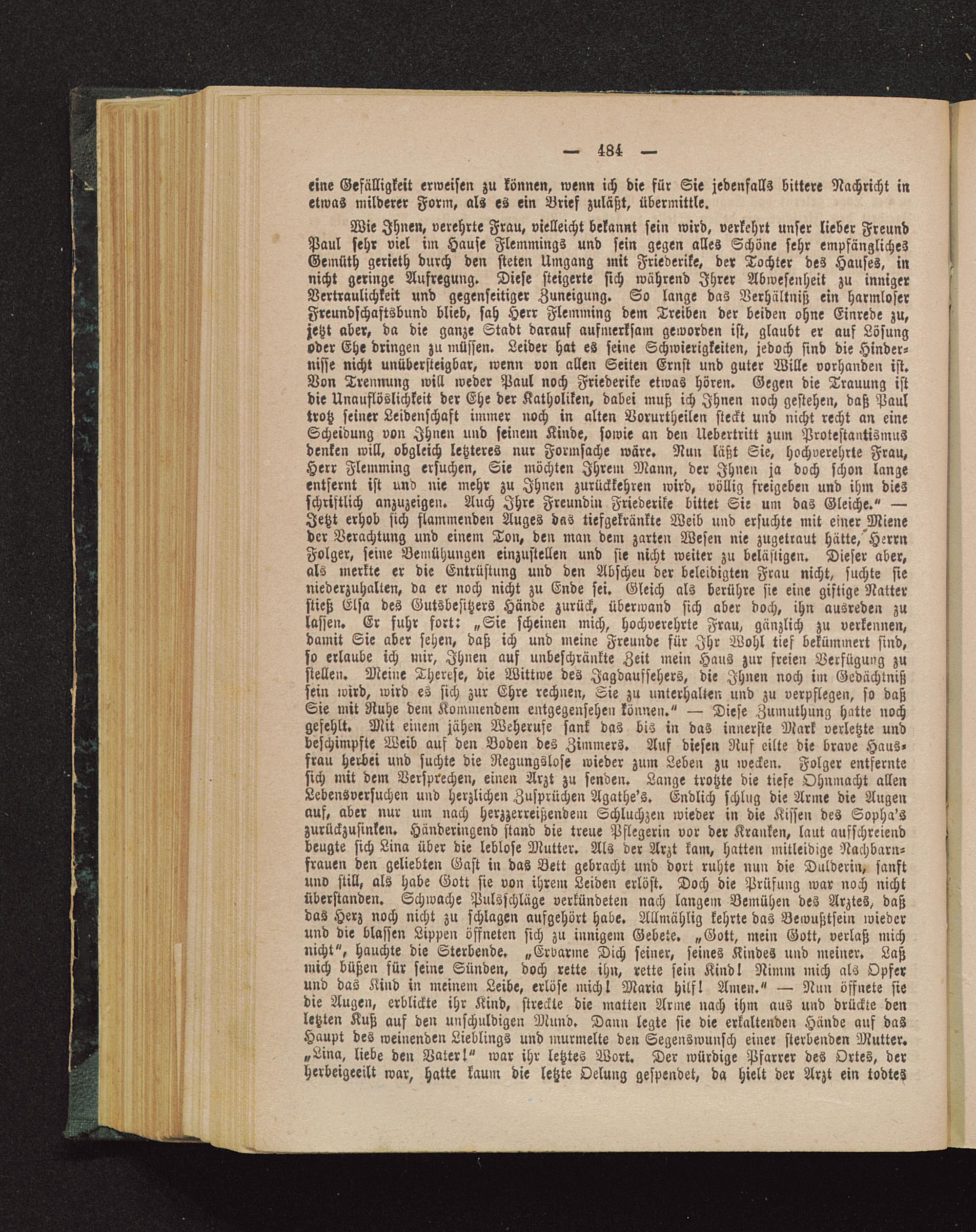 Wie Ihnen, verehrte Frau, vielleicht bekannt sein wird, verkehrt unser lieber FreundPaul sehr viel im Hause Flemmings und sein gegen alles Schöne sehr empfänglichesGemüth gerieth durch den steten Umgang mit Friederike, der Tochter des Hauses, innicht geringe Aufregung. Diese steigerte sich während Ihrer Abwesenheit zu innigerVertraulichkeit und gegenseitiger Zuneigung. So lange das Verhältniß ein harmloserFreundschaftsbund blieb, sah Herr Flemming dem Treiben der beiden ohne Einrede zu,jetzt aber, da die ganze Stadt darauf aufmerksam geworden ist, glaubt er auf Lösungoder Ehe dringen zu müssen. Leider hat es seine Schwierigkeiten, jedoch sind die Hinder-nisse nicht unübersteigbar, wenn von allen Seiten Ernst und guter Wille vorhanden ist.Von Trennung will weder Paul noch Friederike etwas hören. Gegen die Trauung istdie Unauflöslichkeit der Ehe der Katholiken, dabei muß ich Ihnen noch gestehen, daß Paultrotz seiner Leidenschaft immer noch in alten Vorurtheilen steckt und nicht recht an eineScheidung von Ihnen und seinem Kinde, sowie an den Uebertritt zum Protestantismusdenken will, obgleich letzteres nur Formsache wäre. Nun läßt Sie, hochverehrte Frau,Herr Flemming ersuchen, Sie möchten Ihrem Mann, der Ihnen ja doch schon langeentfernt ist und nie mehr zu Ihnen zurückkehren wird, völlig freigeben und ihm diesschriftlich anzuzeigen. Auch Ihre Freundin Friederike bittet Sir um das Gleiche." —Jetzt erhob sich flammenden Auges das tiefgekränkte Weib und ersuchte mit einer Mieneder Verachtung und einem Ton, den man dem zarten Wesen nie zugetraut hätte,"HerrnFolger, seine Bemühungen einzustellen und sie nicht weiter zu belästigen. Dieser aber,als merkte er die Entrüstung und den Abscheu der beleidigten Frau nicht, suchte sieniederzuhalten, da er noch nicht zu Ende sei. Gleich als berühre sie eine giftige Natterstieß Elsa des Gutsbesitzers Hände zurück, überwand sich aber doch, ihn ausreden zulassen. Er fuhr fort: „Sie scheinen mich, hochverehrte Frau, gänzlich zu verkennen,damit Sie aber sehen, daß ich und meine Freunde für Ihr Wohl tief bekümmert sind,so erlaube ich mir, Ihnen auf unbeschränkte Zeit mein Haus zur freien Verfügung zustellen. Meine Therese, die Wittwe des Jagdaufsehers, die Ihnen noch im Gedächtnißsein wird, wird es sich zur Ehre rechnen, Sie zu unterhalten und zu verpflegen, so daßSie mit Ruhe dem Kommendem entgegensehen können." — Diese Zumuthung hatte nochgesehlt. Mit einem jähen Weheruse sank das bis in das innerste Mark verletzte undbeschimpfte Weib auf den Boden des Zimmers. Auf diesen Ruf eilte die brave Haus-frau herbei und suchte die Regungslose wieder zum Leben zu wecken. Folger entferntesich mit dem Versprechen, einen Arzt zu senden. Lange trotzte die tiefe Ohnmacht allenLebensversuchen und herzlichen Zusprächen Agathe's. Endlich schlug die Arme die Augenauf, aber nur um nach herzzerreißendem Schluchzen wieder in die Kissen des Sopha'szurückzusinken. Händeringend stand die treue Pflegerin vor der Kranken, laut aufschreiendbeugte sich Lina über die leblose Mutter. Als der Arzt kam, hatten mitleidige Nachbarn-frauen den geliebten Gast in das Bett gebracht und dort ruhte nun die Dulderin, sanftund still, als habe Gott sie von ihrem Leiden erlöst. Doch die Prüfung war noch nichtüberstanden. Schwache Pulsschlüge verkündeten nach langein Bemühen des Arztes, daßdas Herz noch nicht zu schlagen aufgehört habe. Allmählig kehrte das Bewußtsein iviederund die blassen Lippen öffneten sich zu innigem Gebete. „Gott , mein Gott, verlaß michnicht", hauchte die Sterbende. „Ervarme Dich seiner, seines Kindes und meiner. Laßmich büßen für seine Sünden, doch rette ihn, rette sein Kind! Nimm mich als Opferund das Kind in meinem Leibe, erlöse mich! Maria hilf! Amen." — Nun öffnete siedie Augen, erblickte ihr Kind, streckte die matten Arme nach ihm aus und drückte denletzten Kuh auf den unschuldigen Mund. Dann legte sie die erkaltenden Hände auf dasHaupt des weinenden Lieblings und murmelte den Segenswunsch einer sterbenden Mutter.„Lina, liebe den Vater!" war ihr letztes Wort. Der würdige Pfarrer des Ortes, derherbeigeeilt war, hatte kaum die letzte Oelung gespendet, da hielt der Arzt ein todtes