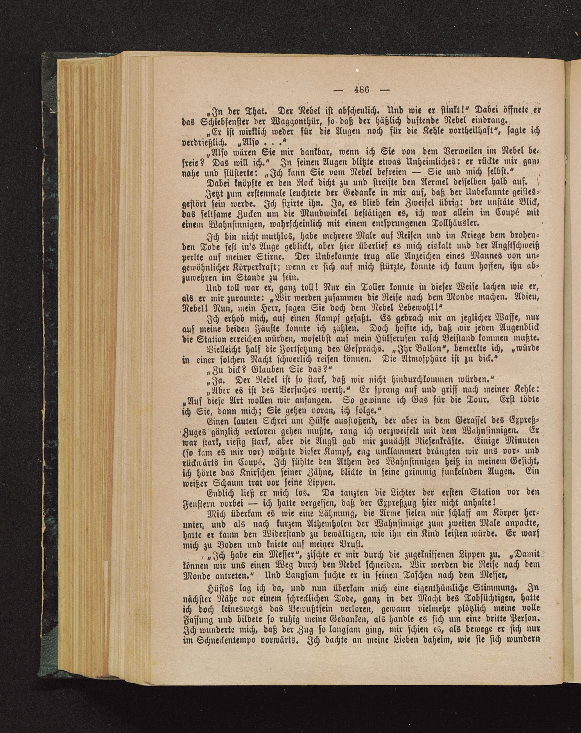 Jetzt zum erstenmale leuchtete der Gedanke in mir auf, daß der Unbekannte geistes-gestört sein werde. Ich fixirte ihn. Ja, es blieb kein Zweifel übrig: der unstäte Blick,das seltsame Zucken um die Mundwinkel bestätigen es, ich war allein im Coupä miteine»» Wahnsinnigen, wahrscheinlich mit einem entsprungenen Tollhäusler.