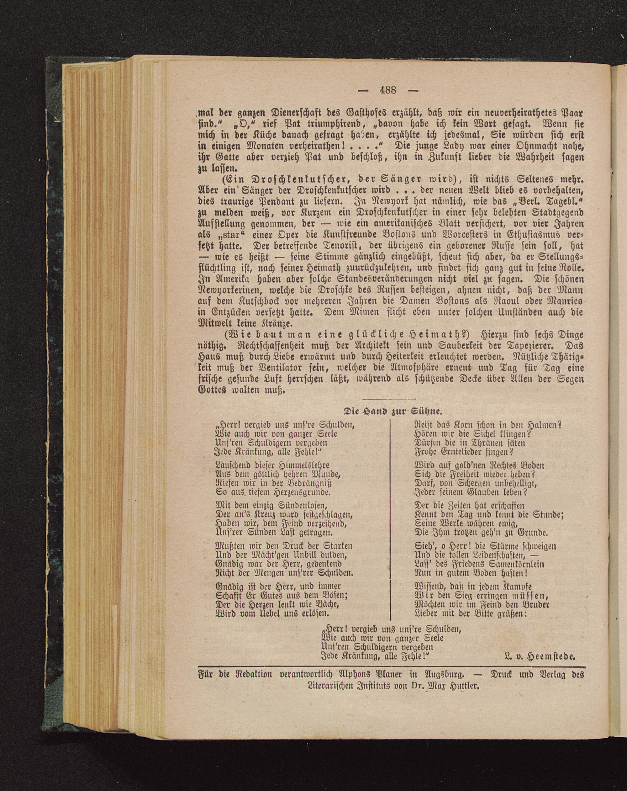 (Wie baut man eine glückliche Heimath?) Hierzu sind sechs Dingenöthig. Rechtschaffenheit muß der Architekt sein und Sauberkeit der Tapezierer. DasHaus muß durch Liebe erwärmt und durch Heiterkeit erleuchtet werden. Nützliche Thätig»keil muß der Ventilator sein, welcher die Atmosphäre erneut und Tag für Tag einefrische gesunde Luft herrschen läßt, während als schützende Decke über Alle» der SegenGottes walten muß.