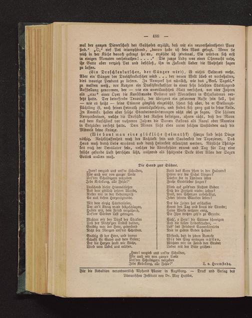(Ein Droschkenkutscher, der Sänger wird), ist nichts Seltenes mehr.Aber ein Sänger der Droschkenkutscher wird ... der neuen Welt blieb es vorbehalten,dies traurige Pendant zu liefern. In Newyork hat nämlich, wie das „Berl. Tagebl."zu melden weiß, vor Kurzem ein Droschkenkutscher in einer sehr belebten StadtgegendAufstellung genommen, der — wie ein amerikanisches Blatt versichert, vor vier Jahrenals „stur" einer Oper die Kunstfreunde Bostons und Worcesters in Ethusiasmus ver-setzt hatte. Der betreffende Tenorist, der übrigens ein geborener Nüsse sein soll, hat— wie es heißt — seine Stimme gänzlich eingebüßt, scheut sich aber, da er Stellungs-flüchtling ist, nach seiner Heimath zuurückzukehren, und findet sich ganz gut in seine Rolle.In Amerika haben aber solche Standesveränderungen nicht viel zu sagen. Die schönenNewyorkerinen, welche die Droschke des Russen besteigen, ahnen nicht, daß der Mannauf dem Kutschbock vor mehreren Jahren die Damen Bostons als Naoul oder Manricoin Entzücken versetzt hatte. Dem Mimen flicht eben unter solchen Umständen auch dieMitwelt keine Kränze.