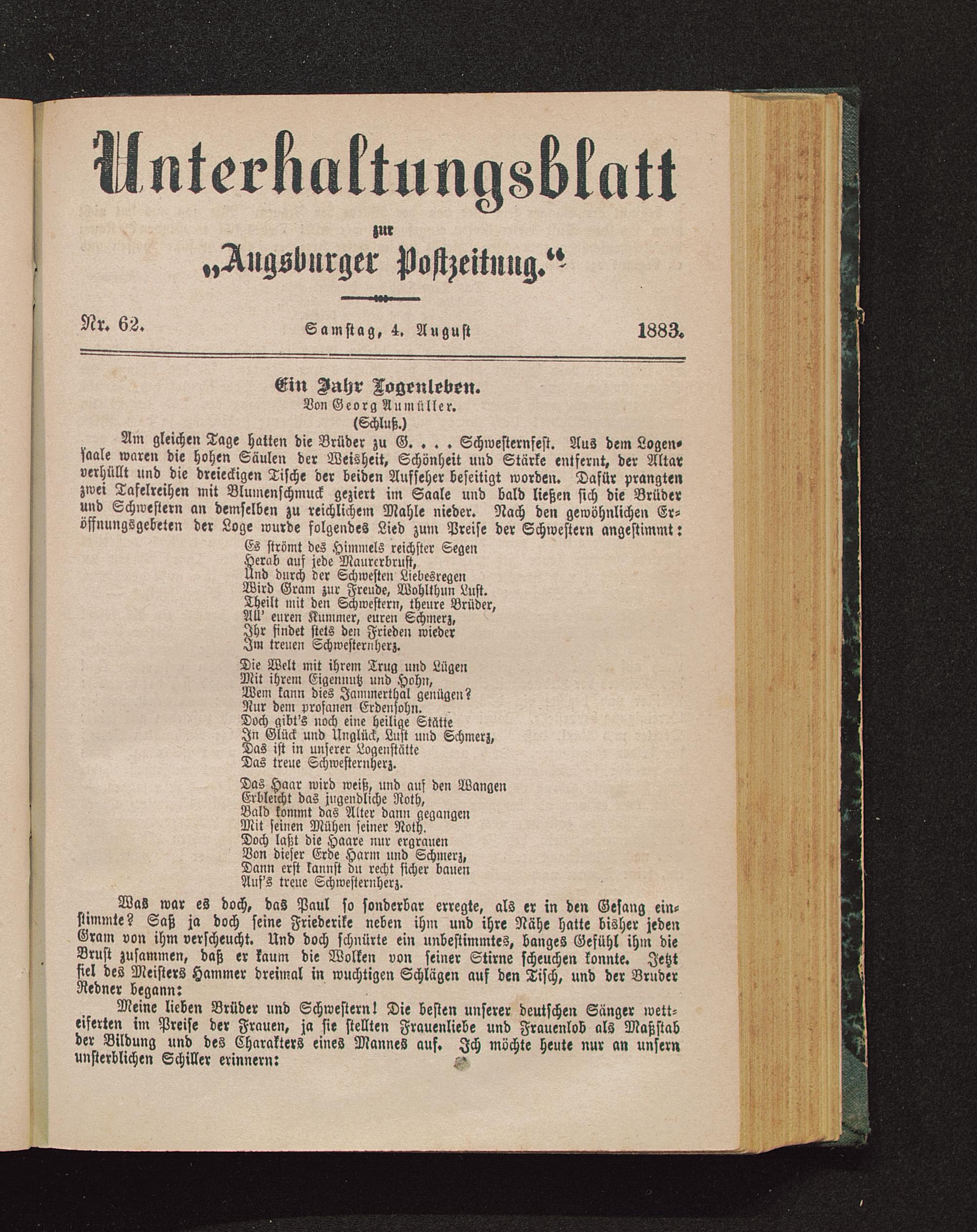 Am gleichen Tage hatten die Brüder zu G. . . . Schwesternfest. Aus dem Logen«)aale waren die hohen Säulen der Weisheit, Schönheit und Stärke entfernt, der Altarverhüllt und die dreieckigen Tische der beiden Aufseher beseitigt worden. Dafür prangtenzwei Tafelreihen mit Blumenschmuck geziert im Saale und bald ließen sich die Brüderund Schwestern an demselben zu reichlichem Mahle nieder. Nach den gewöhnlichen Er-öffnungsgebeten der Loge wurde folgendes Lied zum Preise der Schwestern angestimmt: