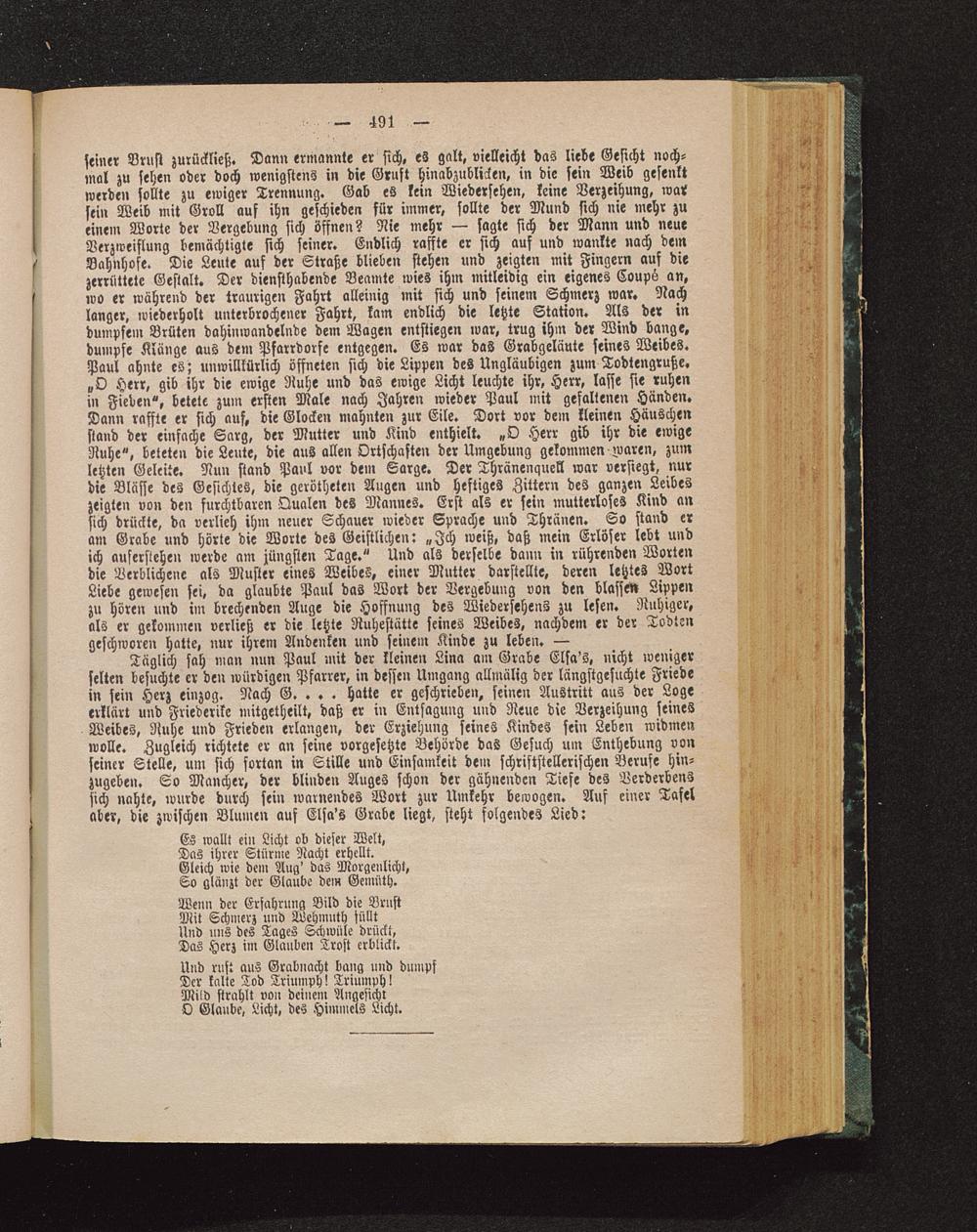Täglich sah man nun Paul mit der kleinen Lina am Grab« Elsa's, nicht wenigerselten besuchte er den würdigen Pfarrer, in dessen Umgang allmalig der längstgesuchte Friedein sein Herz einzog. Nach G. . . . hatte er geschrieben, seinen Austritt aus der Logeerklärt und Friederike mitgetheilt, daß er in Entsagung und Reue die Verzeihung seinesWeibes, Ruhe und Frieden erlangen, der Erziehung seines Kindes sein Leben widme»wolle. Zugleich richtete er an seine vorgesetzte Behörde das Gesuch um Enthebung vonseiner Stelle, um sich fortan in Stille und Einsamkeit dem schriftstellerischen Berufe hin-zugeben. So Mancher, der blinden Auges schon der gähnenden Tiefe des Verderbenssich nahte, wurde durch sein warnendes Wort zur Umkehr bewogen. Auf einer Tafelaber, die zwischen Blumen auf Elsa's Grabe liegt, steht folgendes Lied: