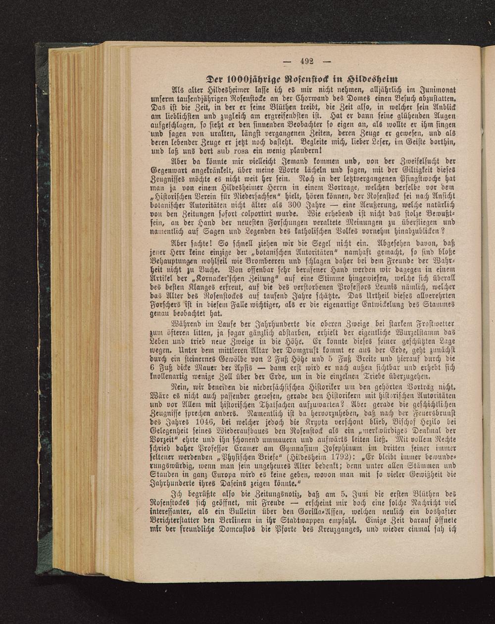 Aber sachte! So schnell ziehen wir die Segel nicht ein. Abgesehen davon, daßjener Herr keine einzige der „botanischen Autoritäten" namhaft gemacht, so sind bloßeBehauptungen wohlfeil wie Brombeeren und schlagen daher bei dem Freunde der Wahr-heit nicht zu Buche. Von offenbar sehr berufener Hand werden wir dagegen in einemArtikel der „Kornacker'schen Zeitung" auf eine Stimme hingewiesen, welche sich überalldes besten Klanges erfreut, auf die des verstorbenen Professors Leunis nämlich, welcherdas Alter des Nosenstockes auf tausend Jahre schätzte. Das Urtheil dieses allverehrtenForschers ist in diesem Falle wichtiger, als er die eigenartige Entwickelung des Stammesgenau beobachtet hat.