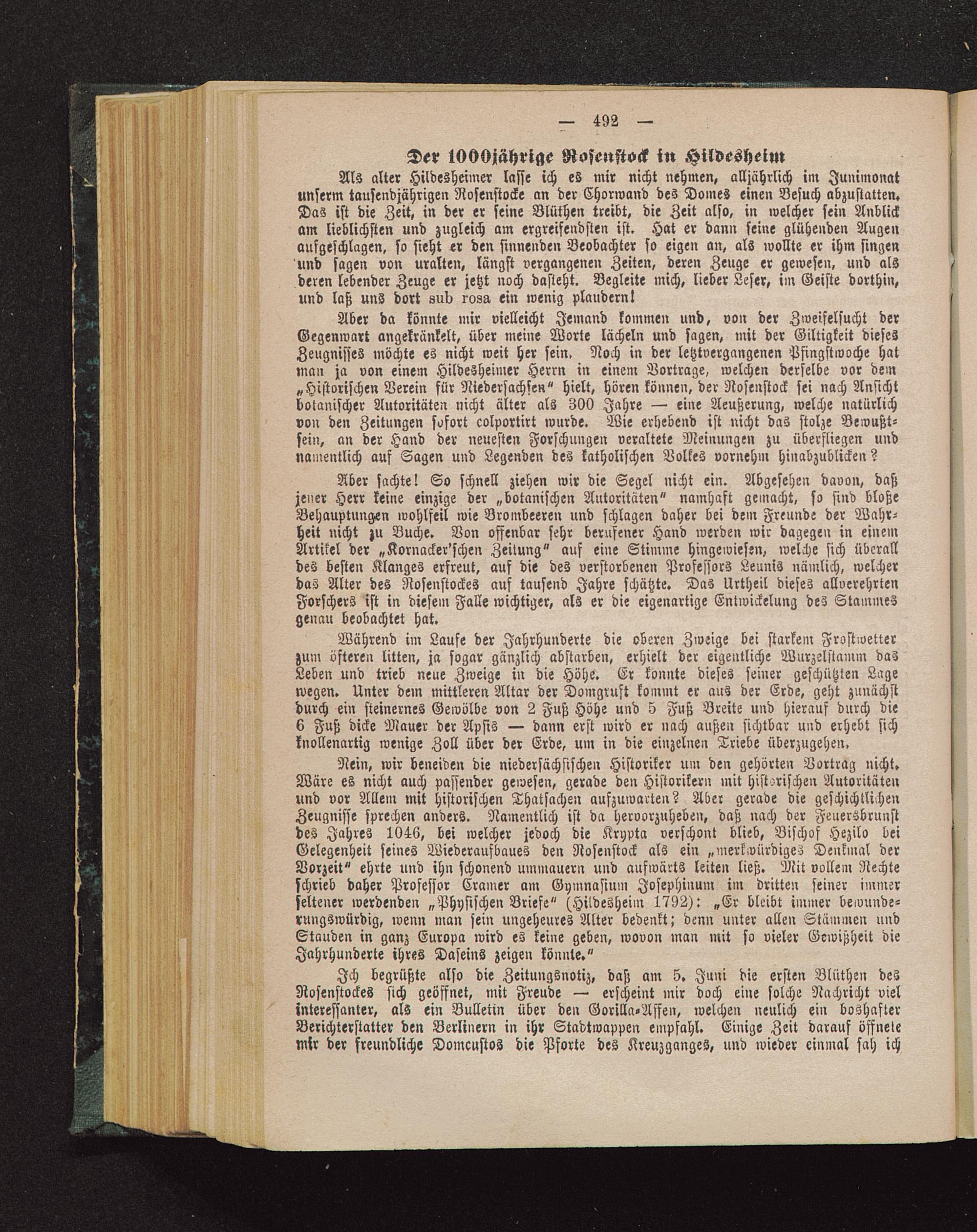 Nein, wir beneiden die niedersächsischen Historiker um den gehörten Vortrag nicht»Wäre es nicht auch paffender gewesen, gerade den Historikern mit historischen Autoritätenund vor Allem mit historischen Thatsachen aufzuwarten? Aber gerade die geschichtlichenZeugnisse sprechen anders. Namentlich ist da hervorzuheben, daß nach der Feuersbrunstdes Jahres 1046, bei welcher jedoch die Krypta verschont blieb, Bischof Hszilo beiGelegenheit seines Wiederaufbaues den Nosenstock als ein „merkwürdiges Denkmal derVorzeit" ehrte und ihn schonend ummauern und aufwärts leiten ließ. Mit vollem Rechteschrieb daher Professor Cramer am Gymnasium Josephinum im dritten seiner immer