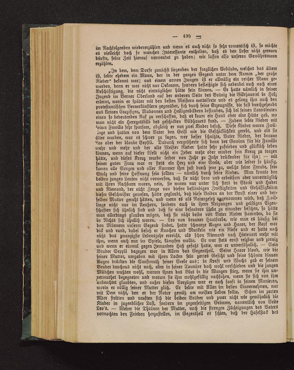 in Nichts sich ähnlich waren. — Leo von brauner Hautfarbe, wie man eS häufig beiden Männern unserer Gegend findet, hatte schwarze Augen und Haare, der Kopf wardick und rund, dabei besaß er Knochen und Muskeln wie ein Niese und er hatte nochnicht das zwanzigste Lebensjahr erreicht, als schon Niemand nach Hirtenart mehr mitihm, wenn auch nur im Spiele, kämpfen wollte. Er war stets ernst reizbar und zornig !und wenn er einmal gegen Jemanden Haß gefaßt hatte, war er unversöhnlich. — SeinBruder Seppli dagegen war in Allem das Gegentheil. Seine Haare blond, wie die f