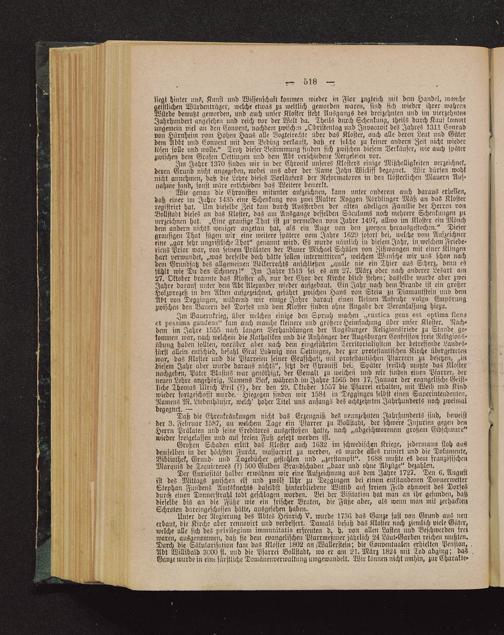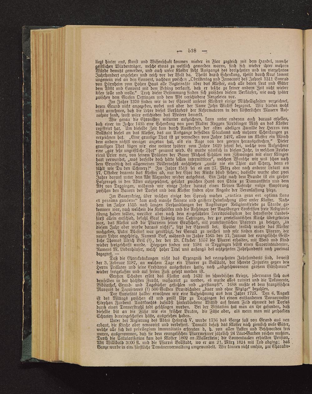Wie genau die Chronisten mitunter auszeichnen, kann unter anderem auch daraus erhellen,Laß einer im Jahre 1135 eine Schenkung von zwei Maller Roggen Nördliuger Mäst an das Klosterrcgistrirt hat. Um dieselbe Zeit kam durch Ausstcrbcu der alten adeligen Familie der Herren vonBollstadt dieses an das Kloster, das am Ausgauge desselben Säculums noch mehrere Schenkungen zuverzeichnen hat. „Eine grausige That ist zu vermelden vorn Jahre 1497, allwo im Kloster ein Mönchdem andern nichts weniger angetan hat, als ein Auge von den zweyen herausgestochen." Diesergrausigen That fügen wir eine weitere spätere vorn Jahre 1629 sofort bei, welche von, Auszeichncreine „gar sehr ungristliche That" genannt wird. Es wurde nämlich in diesem Jahr, in welchem Friede-ricus Prior war, von seinem Prälaten der Bauer Michael Schiffen von Zibwangen niit einer Klingenhart verwundet, „was derselbe doch hätte sollen intermittiren", welchem Wunsche wir uns schon »achdem Grundsatz des allgemeinen Völkerrechts anschlichen „guäle nie ei» Thier aus Scherz, denn esfühlt wie Du den Schmerz!" Im Jahre 1513 sei es am 27. März oder nach anderer Lesart am27. Oktober brannte das Kloster ab, nur der Chor der Kirche blieb stehen; dasselbe wurde aber zweiJahre daraus unter dem Abt Alexander wieder aufgebaut. Ein Jahr nach dem Brande ist ein großerHolzprozcß in den Akten ausgezeichnet, geführt zwischen Haus von Steiu zu Diamautstein und den,Abt von Teggingen, während wir einige Jahre darauf einen kleinen Aufruhr vulgo Empörungzwischen den Bauern des Dorfes und dem Kloster finden ohne Angabe der Veranlassung hiezu.