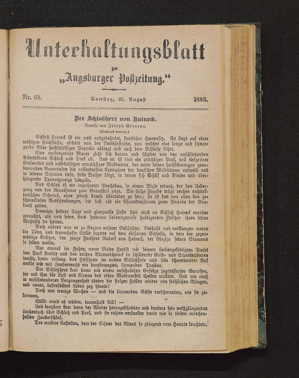 Doch anders war es zu Beginn unserer Geschichte« Verhallt und verklungen warendie Töne, und traumhafte Stille lagerte auf dem einsamen Schlosse, in dem der gegen»wältige Besitzer, der junge Freiherr Rudolf von Haineck, der Einzige seines Stammesso selten weilte.