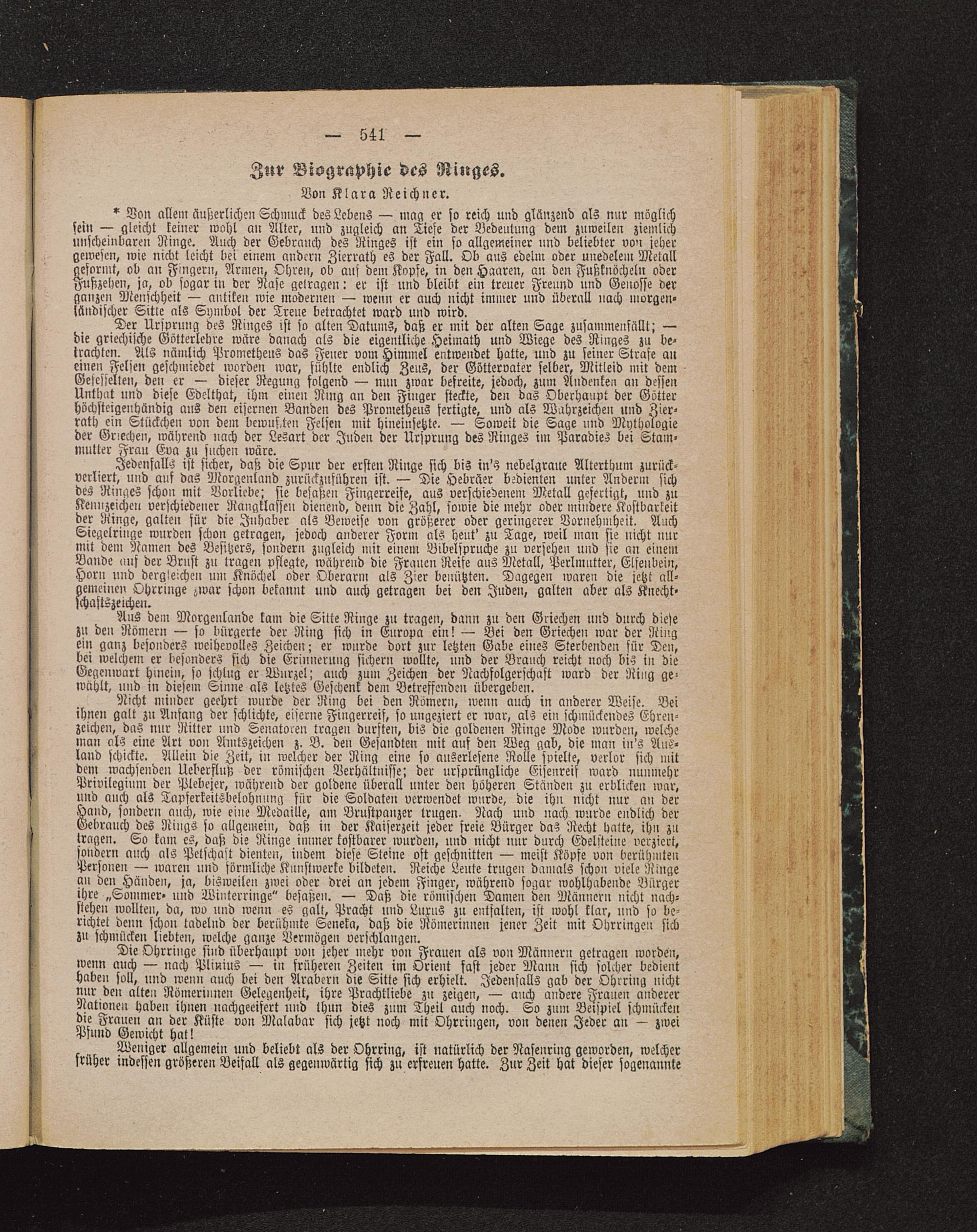 * Von allem äußerlichen Schmuck des Lebens — maa er so reich und glänzend als nur möglichsein — gleicht keiner wohl an Alter, und zugleich an Ticse der Bedeutung dem zuweilen ziemlichunscheinbaren Ringe. Auch der Gebrauch des Ringes ist ein so allgemeiner und beliebter von jehergewesen, wie nickt leicht bei einem andern Zierrath es der Fall. Ob aus edelm oder uuedelem Metallgeformt, ob an Fingern, Armen, Ohren, ob aus dem Kopfe, in den Haaren, an den Fußknöcheln oderFußzehen, ja, ob sogar in der Nase getragen: er ist und bleibt ein treuer Freund und Genosse derganzen Menichheit — antiken wie modernen — wenn er auch nicht immer und überall nach »wrgen-iändischer Sitte als Symbol der Treue betrachtet ward und wird.