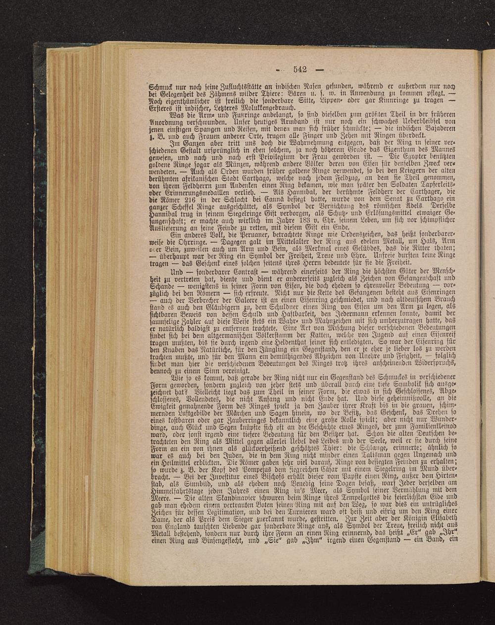 Im Ganzen aber tritt uns doch die Wahrnehmung entgegen, daß der Ring in seiner ver-schiedenen Gestalt ursprünglich in eben solchem, ja noch höherem Grade das Eigenthum des Mannesgewesen, und nach und nach erst Privilegium der Frau geworden ist. — Die Egvpter benutztengoldene Ringe sogar als Münzen, während andere Völker deren von Eisen für denselben Zweck ver-wendeten. — Auch als Orden wurden früher goldene Ringe verwendet, so bei den Kriegern der altenberühmten afrikanischen Stadt Carthago, welche nach jedem Feldzug, au dem sie Theil genommen,von ihrem Feldherrn zum Andenken einen Ring bekamen, wie man später den Soldaten Tapserkeits-vder Erinnerungsmedaillen verlieh. — Als Hanmbal, der berühmte Feldherr der Carthager, diedie Römer 216 in der Schlacht bei Caunä besiegt hatte, wurde von dem Senat zu Carthago einganzer Scheffel Ringe ausgeschüttet, als Symbol der Vernichtung des römischen Adels. DerselbeHannibal trug in seinem Siegelringe Gift verborgen, als Schutz- und Erlösungsmittel etwaiger Ge-stmgenschaft; er machte auch wirklich im Jahre 183 v. Chr. seinem Leben, um sich vor schimpflicherAuslieferung an seine Feinde zu retten, mit diesem Gist ein Ende.