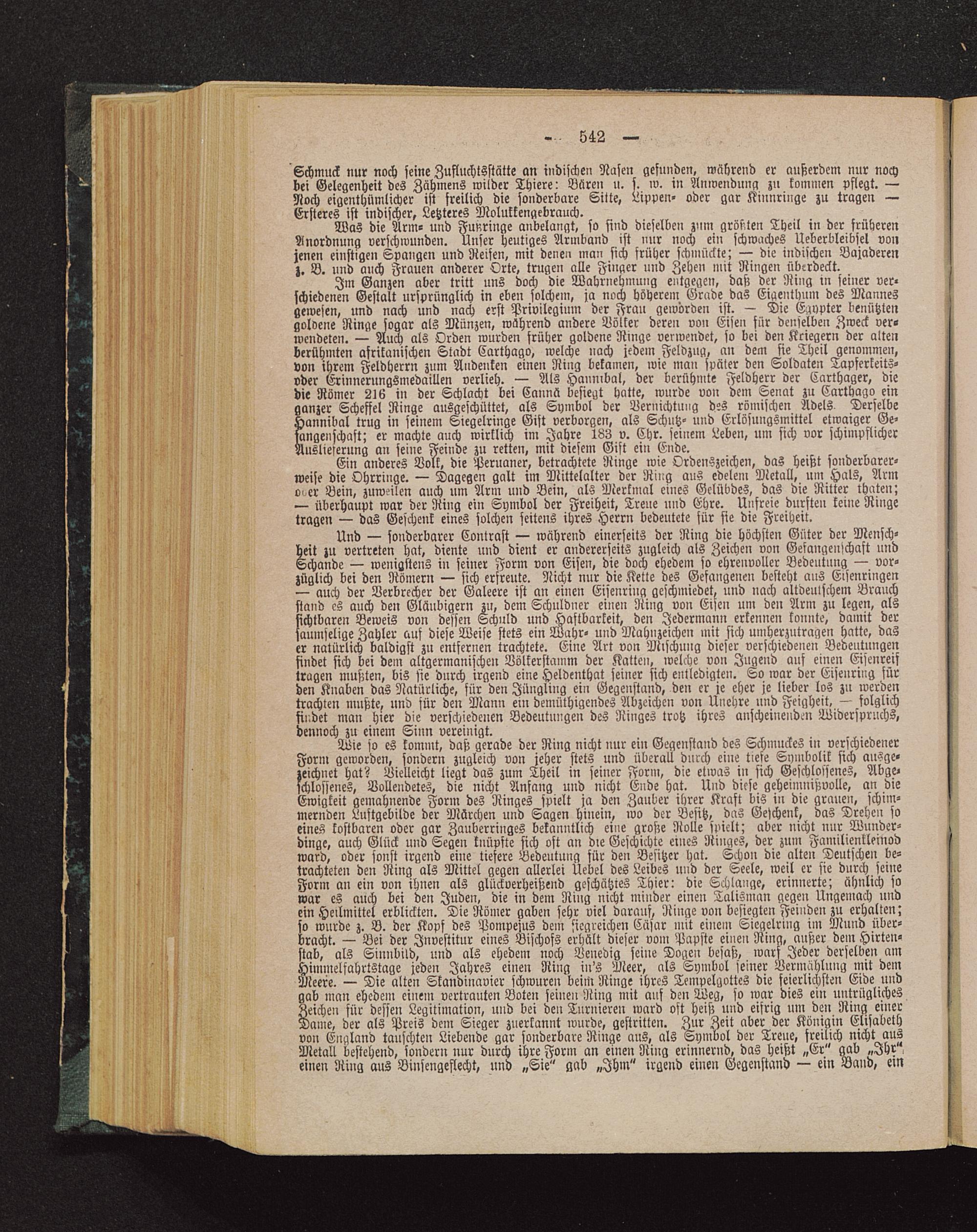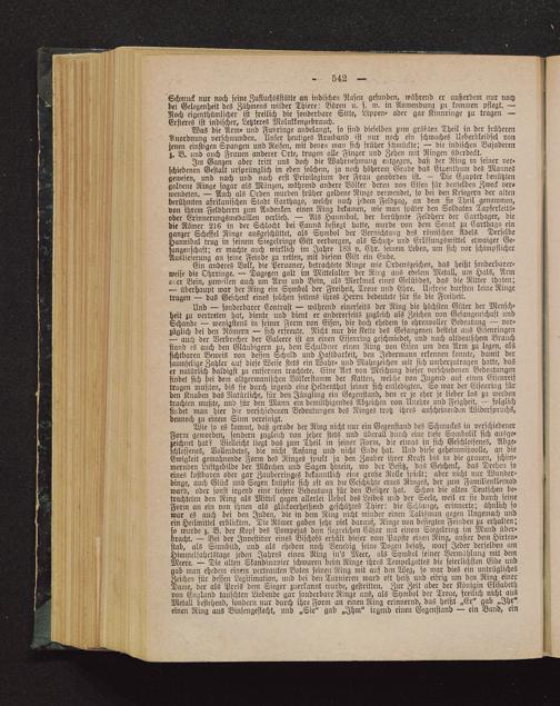 Ein anderes Volk, die Peruaner, betrachtete Ringe wie Ordenszeichen, das heißt sonderbarer-weise die Ohrringe. — Dagegen galt im Mittelalter der Ring aus edelem Metall, um Hals, Armw er Bein, zuweilen auch um Arm und Bein, als Merkmal eines Gelübdes, das die Ritter thaten;