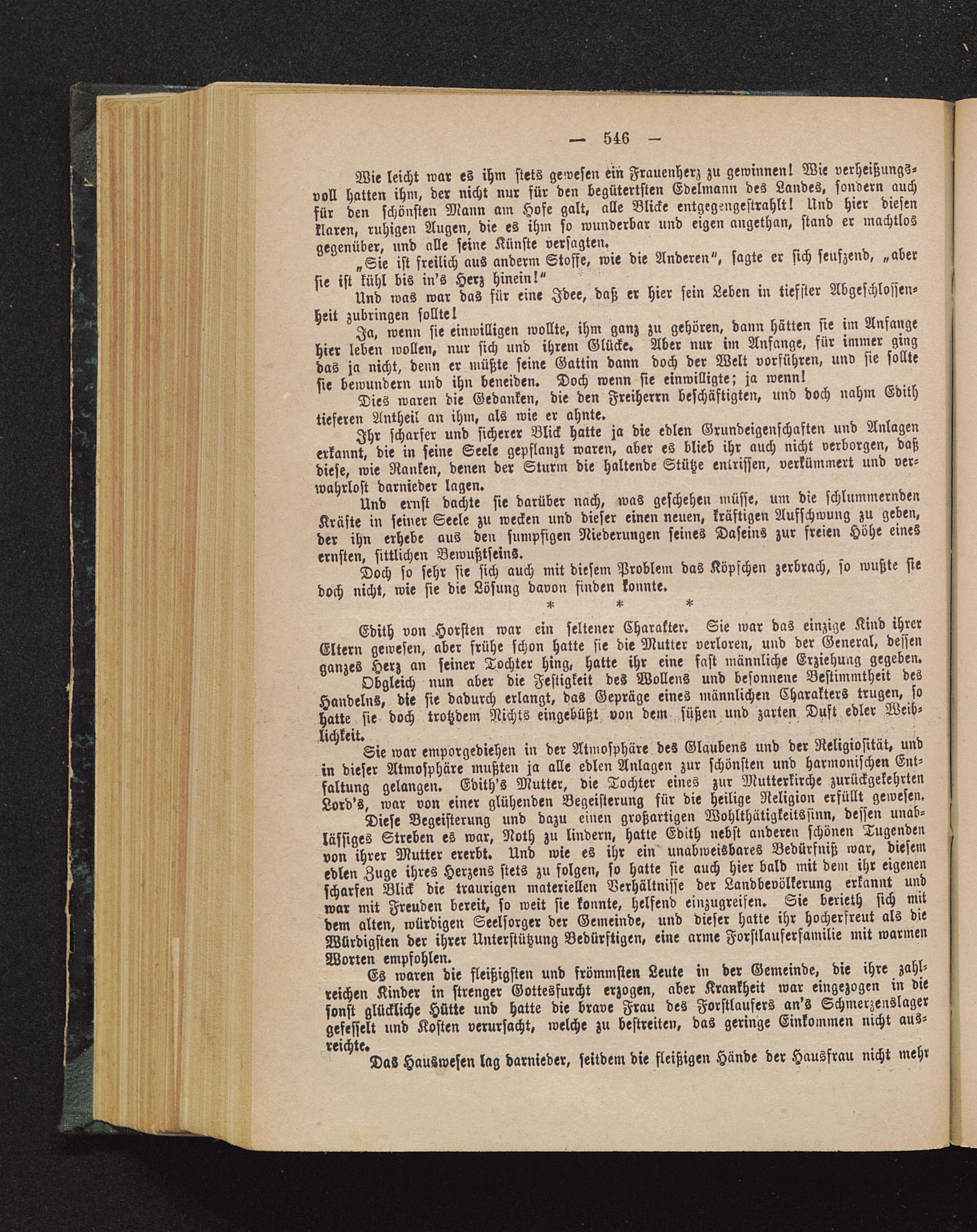 Diese Begeisterung und dazu einen großartigen Wohlthätigkeitssinn» dessen unab-lässiges Streben es war, Noth zu lindern, hatte Edith nebst anderen schönen Tugendenvon ihrer Mutter ererbt. Und wie es ihr ein unabweisbares Bedürfniß war, diesemedlen Zuge ihres Herzens stets zu folgen, so hatte sie auch hier bald mit dem ihr eigenenscharfen Blick die traurigen materiellen Verhältnisse der Landbevölkerung erkannt undwar mit Freuden bereit, so weit sie konnte, helfend einzugreifen. Sie berieth sich mitdem alten, würdigen Seelsorger der Gemeinde, und dieser hatte ihr hocherfreut als dieWürdigsten der ihrer Unterstützung Bedürftigen, eine arme Forstlauferfamilie mit warmenWorten empfohlen.