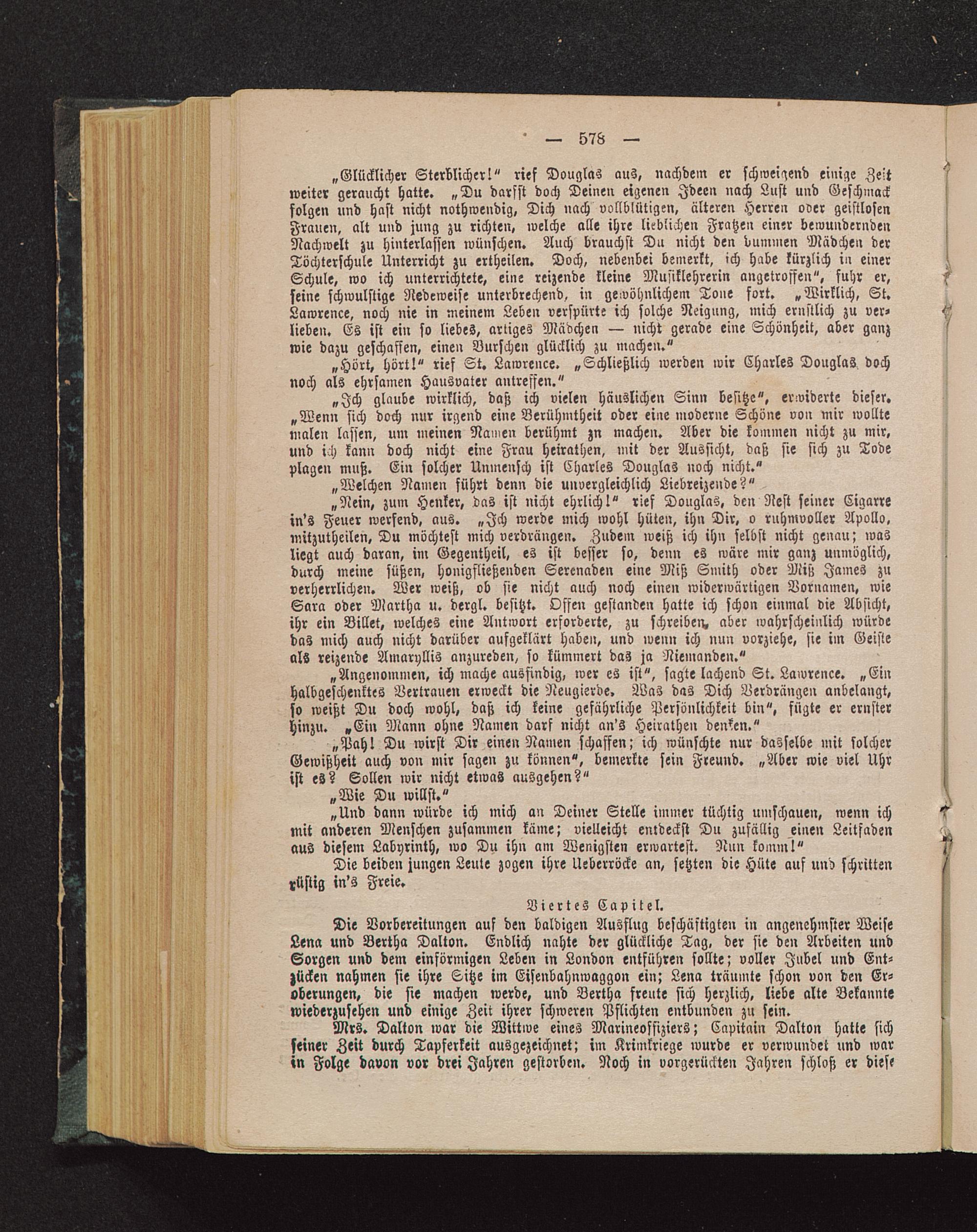 „Glücklicher Sterblicher!" rief Douglas aus, nachdem er schweigend einige Zeitweiter geraucht hatte. „Du darfst doch Deinen eigenen Ideen nach Lust und Geschmackfolgen und hast nicht nothwendig, Dich nach vollblütigen, älteren Herren over geistlosenFrauen, alt und jung zu richten, welche alle ihre lieblichen Fratzen einer bewunderndenNachwelt zu hinterlassen wünschen. Auch brauchst Du nicht den dummen Mädchen derTöchterschule Unterricht zu ertheilen. Doch, nebenbei bemerkt, ich habe kürzlich in einerSchule, wo ich unterrichtete, ein- reizende kleine Musiklehrerin angetroffen", fuhr er,seine schwülstige Redeweise unterbrechend, in gewöhnlichem Tone fort. „Wirklich, St.Lawrence, noch nie in meinem Leben verspürte ich solche Neigung, mich ernstlich zu ver-lieben. Es ist ein so liebes, artiges Mädchen — nicht gerade eine Schönheit, aber ganzwie dazu geschaffen, einen Burschen glücklich zu machen."