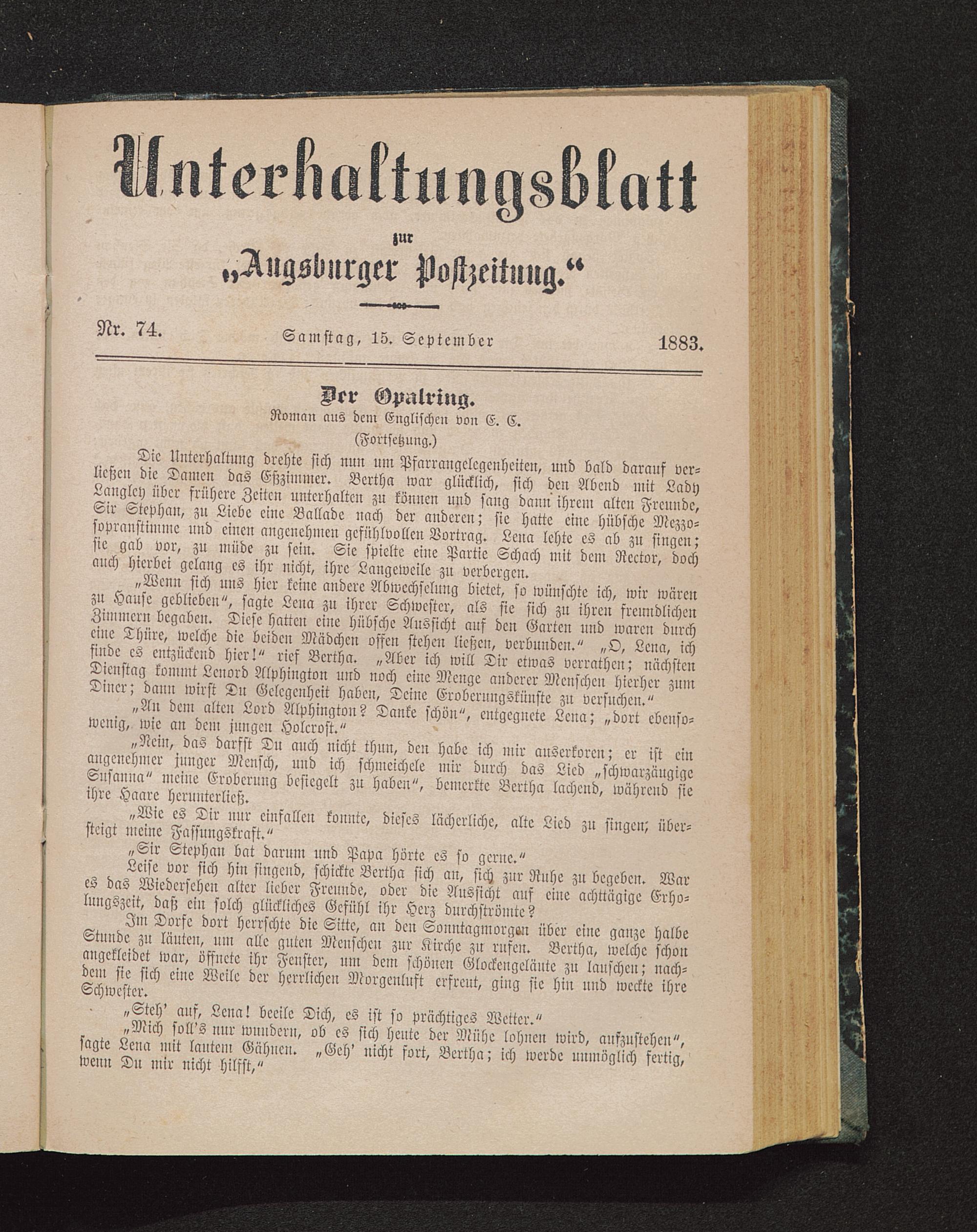 „Wenn sich uns hier keine andere Abwechselung bietet, so wünschte ich, wir wärenzu Hause geblieben", sagte Lena zu ihrer Schwester, als sie sich zu ihren freundlichenZimmern begaben. Diese hatten eine hübsche Aussicht auf den Garten und waren durcheine Thüre, welche die beiden Mädchen offen stehen ließen, verbunden." „O, Lena, ichfinde es entzückend hier!" rief Bertha. „Aber ich will Dir etwas verrathen; nächstenDienstag kommt Lcnord Alphington und noch eine Menge anderer Menschen hierher zumDiner; dann wirst Tu Gelegenheit haben, Deine Erobcrnngskünste zu versuchen."