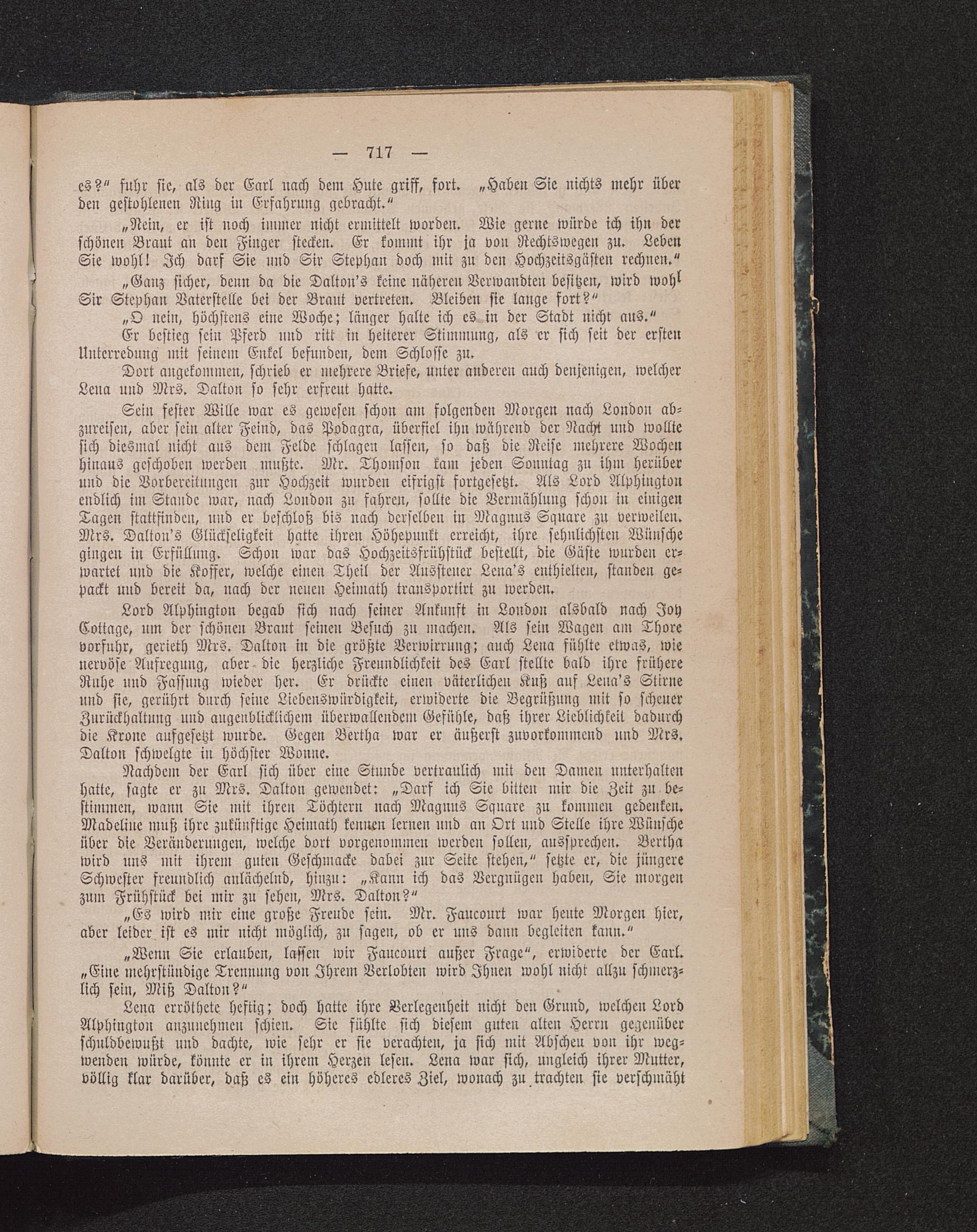 Sein fester Wille war es gewesen schon am folgenden Morgen nach London ab-zureisen, aber sein alter Feind, das Podagra, überfiel ihn während der Nacht und wolltesich diesmal nicht aus dem Felde schlagen lassen, so daß die Reise mehrere Wochenhinaus geschoben werden mußte. Mr. Thomson kam jeden Sonntag zu ihm herüberund die Vorbereitungen zur Hochzeit wurden eifrigst fortgesetzt. Als Lord Alphingtonendlich im Stande war, nach London zu fahren, sollte die Vermählung schon in einigenTagen stattfinden, und er beschloß bis nach derselben in Magnns Sqnare zu verweilen.Mrs. Dalton's Glückseligkeit hatte ihren Höhepunkt erreicht, ihre sehnlichsten Wünschegingen in Erfüllung. Schon war das Hochzeitsfrühstück bestellt, die Gäste wurden er-wartet und die Koffer, welche einen Theil der Aussteuer Lcna's enthielten, standen ge-packt und bereit da, nach der neuen Heimath transportirt zu werden.