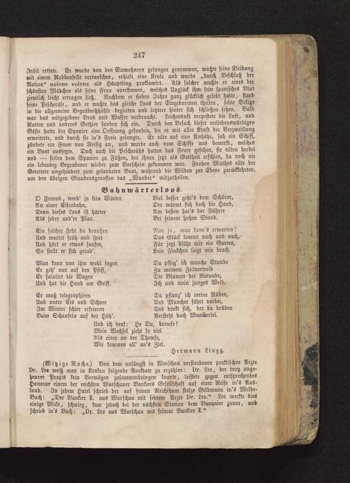 (Witzige Rache.) Von dem unlängst in Warschau verstorbenen praktischen ArzteDr. Le» weiß man in Krakau folgende Anekdote zu erzählen: I)r. Leo, der trotz unge-heurer Praxis kein Vermögen zusammenbringen konnte, leistete gegen entsprechendesHonorar einem der reichsten Warschauer Bankiers Gesellschaft auf einer Reise in's Aus-land. In jedem Hotel schrieb der auf seinen Reichthum stolze Gcldmann in's Melde-Buch: „Der Bankier T. aus Warschau mit seinem Arzte llr. Leo." Leo merkte dieseinige Male, schwieg, kam jedoch bei der nächsten Station dem Banquier zuvor, undschrieb in's Buch: „Dr. Leo aus Warschau mit seinem Bankier T."