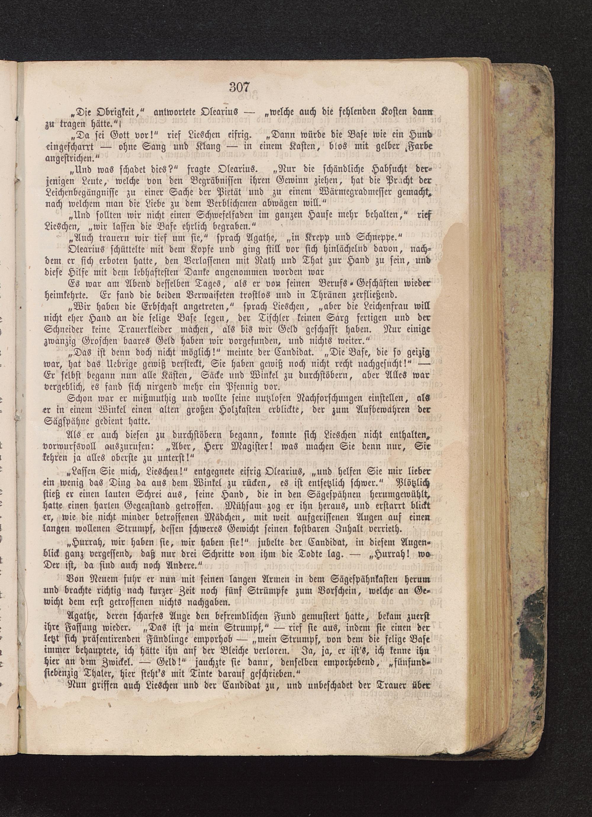 letzt sich präsentirenden Fündlinge emporhob — „mein Strumpf, von dem die selige Baseimmer behauptete, ich hätte ihn anf der Bleiche verloren. Ja, ja, er ist'S, ich kenne ihnhier an dem Zwickel. — Geld!" jauchzte sie dann, denselben emporhebend, „fünfund»stebenzig Thaler, hier stcht's mit Tinte darauf geschrieben."