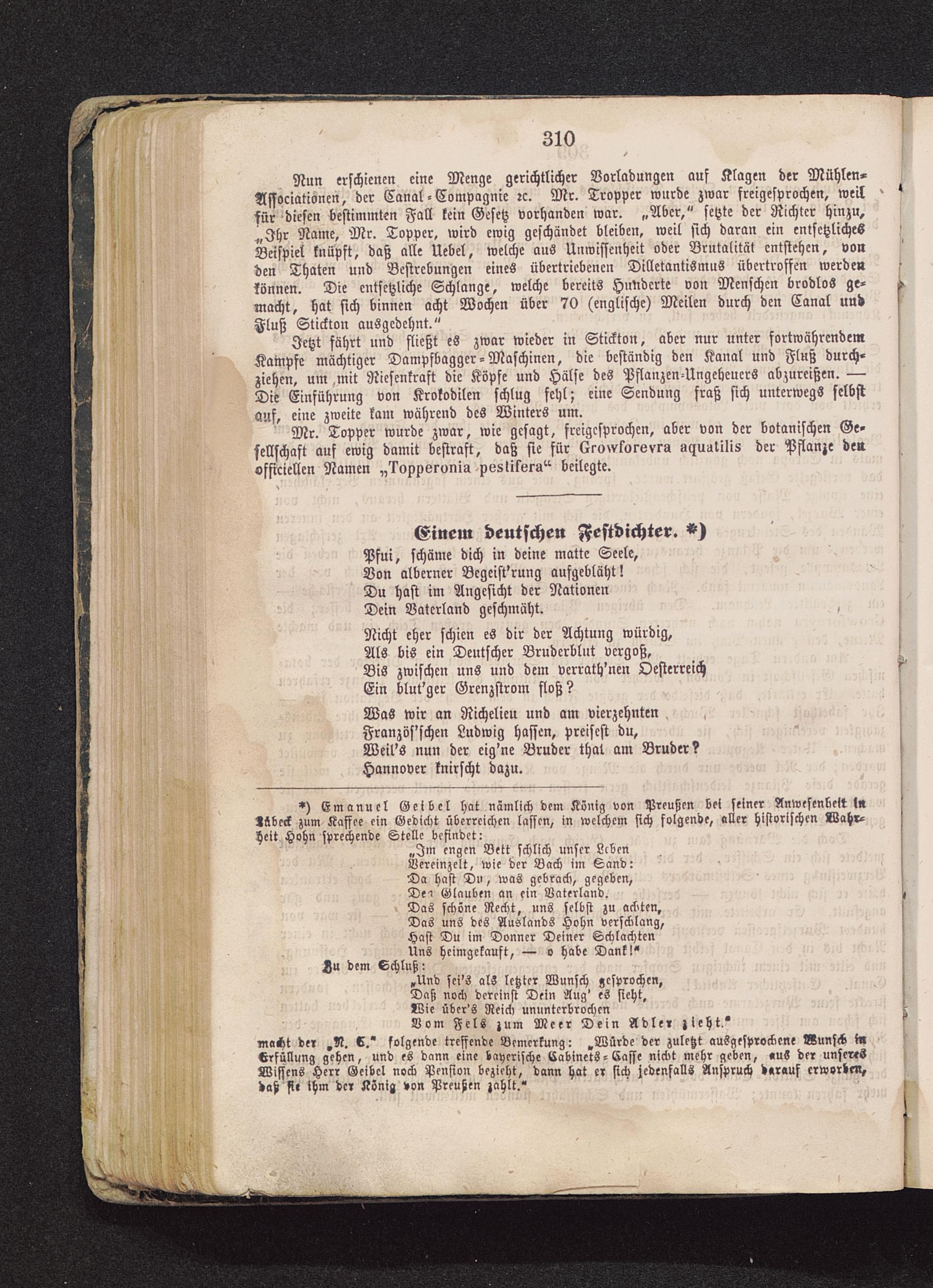 *) Emanucl Geibel hat nämlich dem König von Preußen bei seiner Anwesenkelt ln>äbeck zum Kaffee ein Gedicht überreichen lasten, in welchem sich folgende, aller historischen Wahr-heit. Hohn sprechende Stelle befindet:
