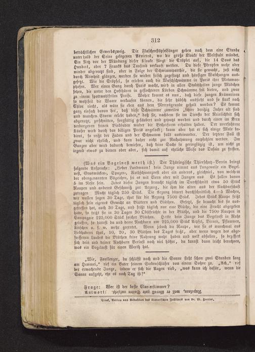 (Was ein Vogelnest werth ist.) Der Thüringische Thierschutz-Verein bringtfolgende Ansprache: „Lieber Landmann! dein Junge nimmt aus Langeweile ein Vogel-nest, Grasmücken-, Spazen-, Nothschwauznest oder ein anderes, gleichviel, von welchemder obengeiiaunten Vögclchcn, sei es mit Eiern oder mit Zungen aus Es sollen davon5 im Neste sei». Jedes dieser Jungen braucht täglich im Durchschnitt etwa 50 StückRaupen und anderes Geschmeiß zur Aezung, die ihm die alten aus der Nachbarschaftzutragen Macht täglich 250 Stück. Die Aezung däuert durchschnittlich 4—5 Wochen,wir wollen sagen 30 Tage, thut für die Aezung 7500 Stück. Jedes Stück Raupe frißttäglich sein eigenes Gewicht au Blättern und Blüthen. Gesetzt, sie braucht bis sie aus-gcfrcssen hat, auch 30 Tage, und frißt täglich nur eine Blüthe, die eine Frucht abgegebenhatte, so frißt sie in 30 Tagen 30 Dbstfrüchte in der Blüthe, und die 7500 Raupen inCompagnie 225,000 Stück solcher Blüthen. Hute dein Junge das Vogelnest in Ruhegelassen, so hättest du und deine Nachbarn um 225.000 Stück Acpsel, Birnen, Pflaumen,Kirschen u. s. w. mehr gcerntet. Wenn jedoch die Raupe, wie sie es manchmal ausLiebhaberei thut, 10, 20, 30 Blüthen des Tages frißt, oder wenn wegen des abge-fressenen Laubes die Blüthen keine Nahrung mehr haben und welk abfallen, so beziffertsich dein und deiner Nachbarn Verlust noch viel höher, du kannst dann leicht berechnen,was ein Vogelnest für einen Werth hat.