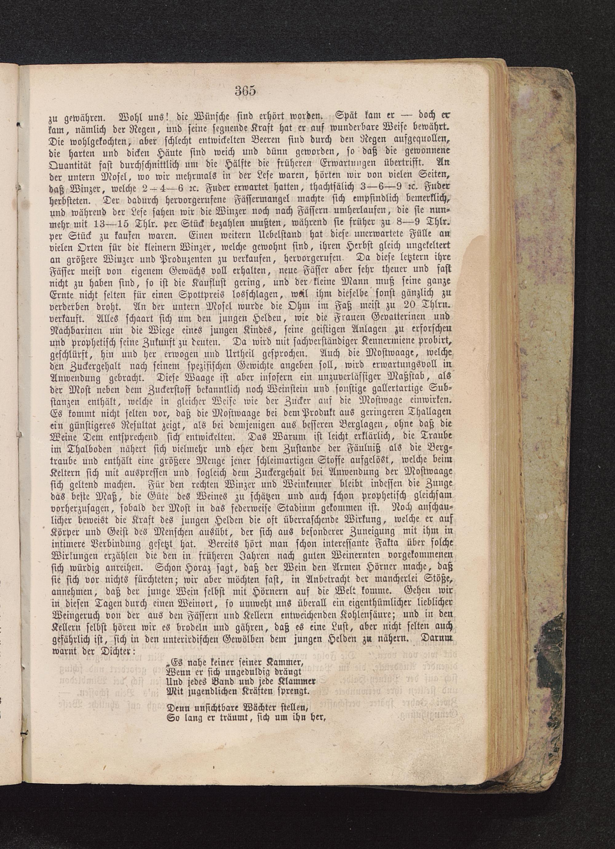zu gewähren. Wohl uns! die Wünsche sind erhört worden. Spät kam er — doch erkam, nämlich der Regen, und seine segnende Kraft hat er auf wunderbare Weise bewährt.Die wohlgekochten, aber schlecht entwickelten Beeren sind durch den Regen aufgequollen,die harten und dicken Häute sind weich und dünn geworden, so daß die gewonneneQuantität fast durchschnittlich um die Hälfte die früheren Erwartungen übertrifft. Ander untern Mosel , wo wir mehrmals in der Lese waren, hörten wir von vielen Seiten,daß Winzer, welche 2-4—6 rc. Fuder erwartet hatten, thachtsälich 3—6—9 rc. Fuderherbsteten. Der dadurch hervorgerufene Fäffermangel machte sich empfindlich bcmerklich,und während der Lese sahen wir die Winzer noch nach Fässern umherlaufen, die sie nun-mehr mit 13—15 Thlr. per Stück bezahlen mußten, während sie früher zu 8—9 Thlr.per Stück zu kaufen waren. Einen wcitern Uebelstand hat diese unerwartete Fülle anvielen Orten für die kleinern Winzer, welche gewohnt sind, ihren Herbst gleich ungekeltertan größere Winzer und Produzenten zu verkaufen, hervorgerufen. Da diese letztem ihreFässer meist von eigenem Gewächs voll erhalten, neue Fässer aber sehr theuer und fastnicht zu haben sind, so ist die Kauflust gering, und der kleine Mann muß seine ganzeErnte nicht selten für einen Spottpreis losschlagen, wsil ihm dieselbe sonst gänzlich zuverderben droht. An der untern Mosel wurde die Ohm im Faß meist zu 20 Thlrn.verkauft. Alles schaart sich um den jungen Helden, wie die Frauen Gevatterincn undNachbarinen um die Wiege eines jungen Kindes, seine geistigen Anlagen zu erforschenund prophetisch seine Zukunft zu deuten. Da wird mit sachverständiger Kennermiene probirt,geschlürft, hin und her erwogen und Urtheil gesprochen. Auch die Mvstwaagc, welcheden Zuckergehalt nach seinem spezifischen Gewichte angeben soll, wird erwartungsvoll inAnwendung gebracht. Diese Waage ist aber insofern ein unzuverlässiger Maßstab, alsder Most neben dem Zuckerstoff bekanntlich noch Weinstein und sonstige gallertartige Sub-stanzen enthält, welche in gleicher Weise wie der Zucker auf die Mostwage einwirken.Es kommt nicht selten vor, daß die Mostwaage bei dem Produkt aus geringeren Thallagenein günstigeres Resultat zeigt, als bei demjenigen aus besseren Berglagen, ohne daß dieMeine Dem entsprechend sich entwickelten. Das Warum ist leicht erklärlich, die Traubeim Thalboden nähert sich vielmehr und eher dem Zustande der Fäulniß als die Berg-traube und enthält eine größere Menge jener schleimartigen Stoffe aufgelöst, welche beimKeltern sich mit auspressen und sogleich dem Zuckergehalt bei Anwendung der Mostwaagesich geltend machen. Für den rechten Winzer und Weiukcnner bleibt indessen die Zungedas beste Maß, die Güte des Weines zu schätzen und auch schon prophetisch gleichsamvorherzusagcn, sobald der Most in das fedcrweise Stadium gekommen ist. Noch anschau-licher beweist die Kraft des jungen Helden die oft überraschende Wirkung, welche er aufKörper und Geist des Menschen ausübt, der sich aus besonderer Zuneigung mit ihm inintimere Verbindung gesetzt hat. Bereits hört man schon interessante Fakta über solcheWirkungen erzählen die den in früheren Jahren nach guten Weinernten vorgekommenensich würdig anreihen. Schon Horaz sagt, daß der Wein den Armen Hörner mache, daßsie sich vor nichts fürchteten; wir aber möchten fast, in Anbetracht der mancherlei Stöße,annehmen, daß der junge Wein selbst mit Hörnern auf die Welt komme. Gehen wirin diesen Tagen durch einen Weinort, so umweht uns überall ein eigenthümlicher lieblicherWeingeruch von der aus den Fässern und Kellern entweichenden Kohlensäure; und in denKellern selbst hören wir es brodeln und gähren, daß es eine Lust, aber nicht selten auchgefährlich ist, sich in den unterirdischen Gewölben dem jungen Helden zu nähern. Darumwarnt der Dichter: