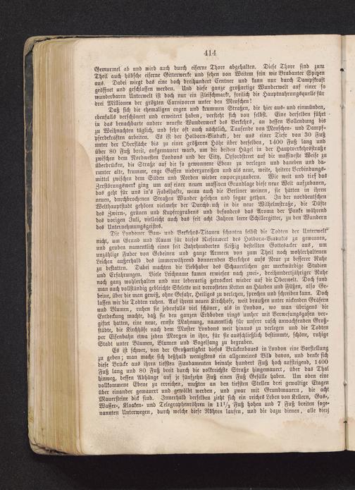 Daß sich die ehemaligen engen und krummen Straßen, die hier aus- und einmünden,ebenfalls verschönert und erweitert haben, versteht sich von selbst. Eine derselben führtin das benachbarte andere neueste Wunderwerk des Verkehrs, an dessen Vollendung biszu Weihnachten täglich, und sehr oft auch nächtlich, Tausende von Menschen- und Dampf-pferdekräften arbeiten. Es ist der Holborn-Viadukt, der aus einer Tiefe von 30 Fußunter der Oberfläche bis zu einer größeren Höhe über derselben, 1400 Fuß lang undüber 80 Fuß breit, ausgemauert ward, um die beiden Hügel in der Hauptverkehrsstraßezwischen dem Nordwesten Londons und der City, Oxfordstrcet auf die massiveste Weise zuüberbrücken, dir Straße auf die so gewonnene Ebene zu verlegen und daneben und da-runter alte, krumme, enge Gaffen niederzureißen und als neue, weite, heitere Verbindungs-mittel zwischen dem Süden und Norden wieder emporzuzaubern. Wie weit und tief dasZcrstörungswerk ging um auf einer neuen massiven Grundlage diese neue Welt aufzubauen,das geht für uns iu's Fabelhafte, wenn auch die Berliner meinen, sie hätten in ihrenneuen, durchbrochenen Straßen Wunder gesehen und sogar gethan. In der norddeutschenWelthauptstadt gehören vielmehr der Durchb.uch in die neue Wilhelmstraße, die Düftedes Zwirn-, grünen und Kupfergrabens und besonders das Aroma der Panke währenddes vorigen Juli, vielleicht auch das seit acht Jahren leere Schillergitter, zu den Wunderndes Unternehmungsgeistes.